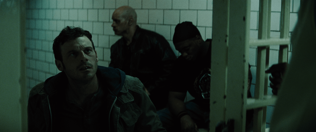 Two police officers encounter the Batman in a decrepit building branding a human trafficker.
