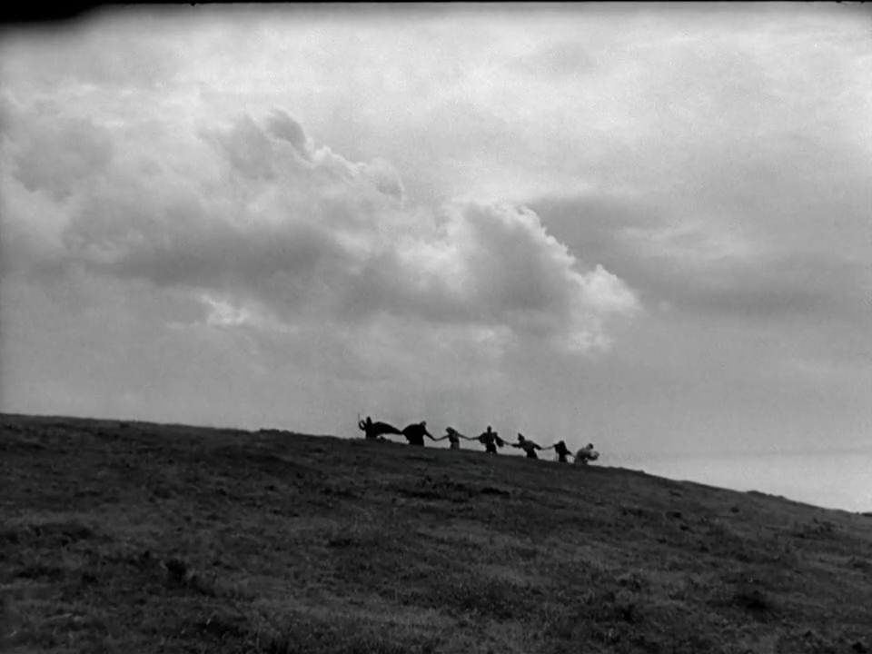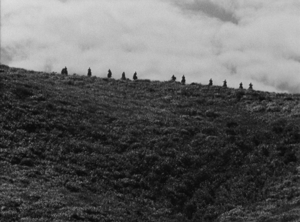 Low-angle wide shot of the hill as the procession enters the field, possibly foreshadowed by the brigade of soldiers on their horses in Nairomi. This shot is a likely reference to the Akira Kurosawa Japanese historical epic Seven Samurai (1954), which served as one of Snyder’s inspirations on Justice League. The shot resembles a similar wide shot of hills where a group of bandits on horseback approach over the horizon, from the tail end of the funeral scene for Heihachi Hayashida, a kindly and charming moral centre among the titular seven warriors who gave his life to save others. The comparison here is obvious.