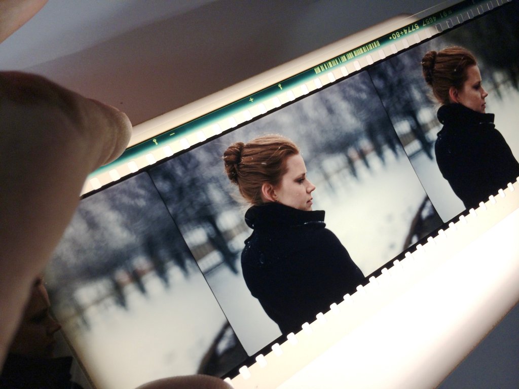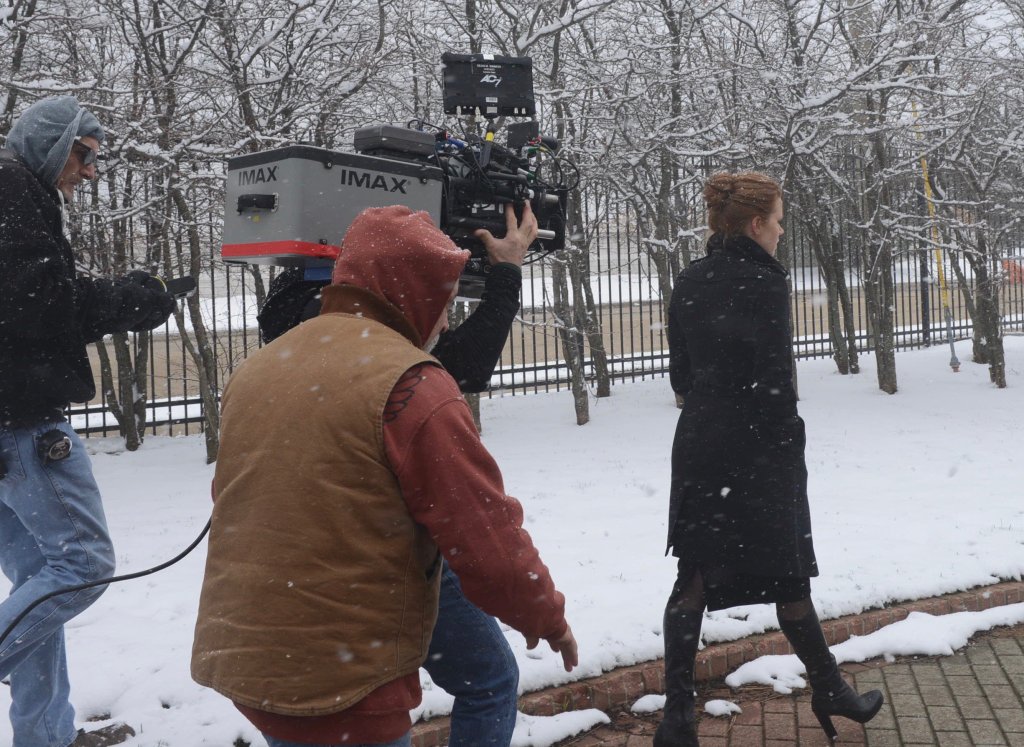Presumably in the Winter of late 2013 or early 2014, the crew conducted a handheld IMAX camera test for viability with Amy Adams in the snow, likely intended to resemble the funeral sequence considering Adams’ attire. Larry Fong has two photos of the test.