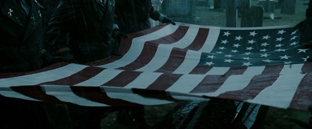 Waist-level shot on Superman’s black coffin in Washington as the officers lift the US flag over it, stretching it out between them. This display is performed often for military funerals and was also seen in Zack Snyder’s Watchmen (2009) during the Comedian’s funeral, possibly making it a reference.