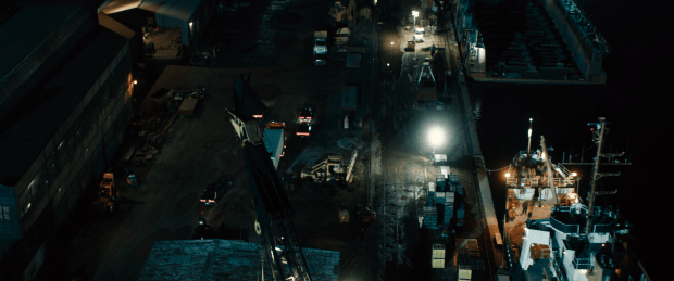 Aerial view of the dock. Down below, the forklift wheels the crate away from the White Portuguese towards the nearby trailer of a truck, surrounded by an escort of black vehicles. In the foreground is a dockside container crane, and the camera ascends to reveal Batman at the top, cape flowing in the wind as he watches the operation unfold. We push on him, obscuring the events unfolding through his black silhouette. This is Batman’s first present-day appearance in-costume since the branding scene, having been devoted to detective work as Bruce Wayne between then and now.