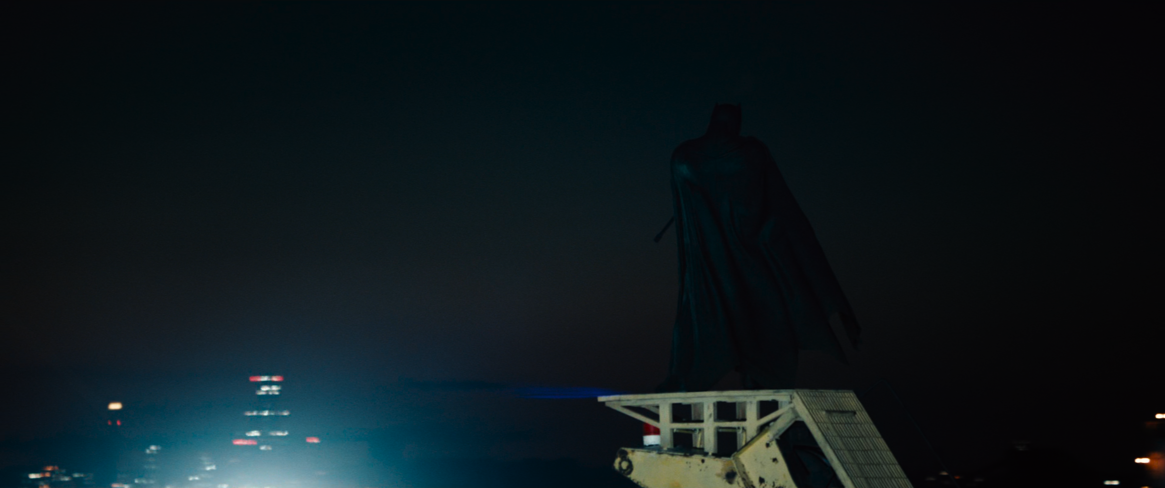 Wide rear shot of Batman against the evening sky. We circle around him, revealing the barrel of a Remington 700 rifle aimed down at the operation below. Zack Snyder confirmed this references panels from The Dark Knight Returns to imply he is about to assassinate someone, which is thematically appropriate when his whole purpose here is to pursue the means of assassinating Superman.
