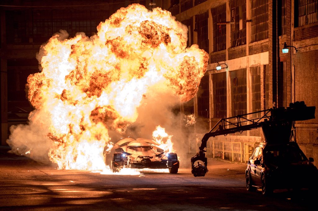 The Batmobile mounted minigun sequence was filmed at the Marathon Petroleum Corporation site at 12800 Toronto Street. The company logo can be seen on the oil containers in the film. MLive.com first reported the location, and it was possibly filmed on 3 September. Set photographer Clay Enos posted a Twitter photo of furnaces and pipes with the sly text, “The plain of Marathon.”