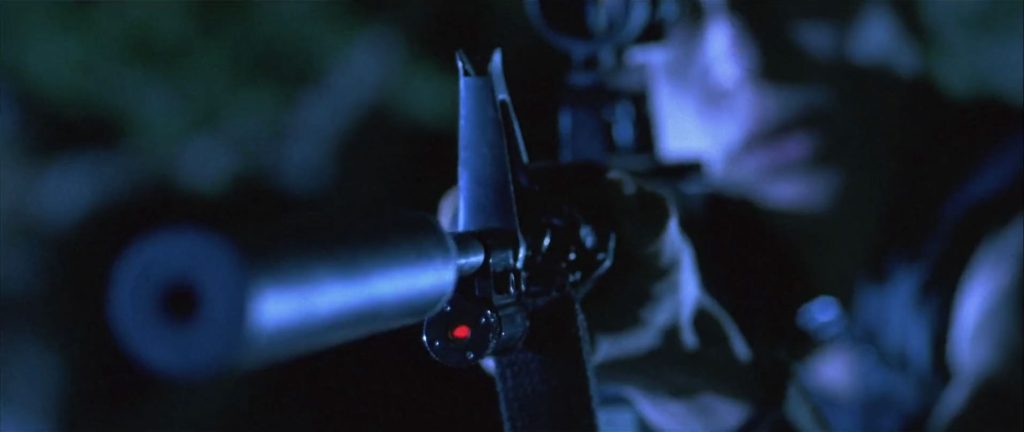 Low-angle shot of Batman from beside his scope, and we pull back to rack focus to the barrel to emphasise him taking aim as he looks through the sight. Considering the thematic similarities between the two films, this may be a reference to a shot from Terminator 2: Judgement Day, where Sarah Connor aims a rifle at the home of Miles Dyson with the intent of killing him to prevent a dystopian future, making this one of several possible references to that film.