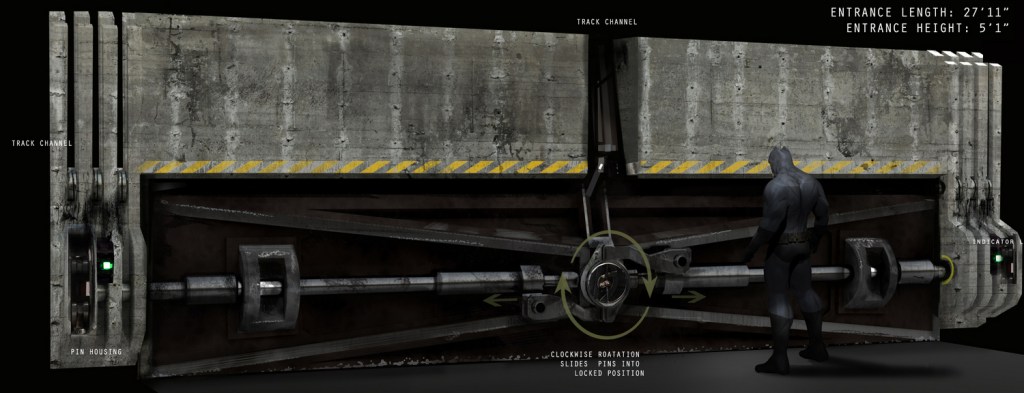 Cut to a large metal hatch, a heavy locking mechanism unlatching to pull the doorway up. The Batmobile comes through, driving right over us.