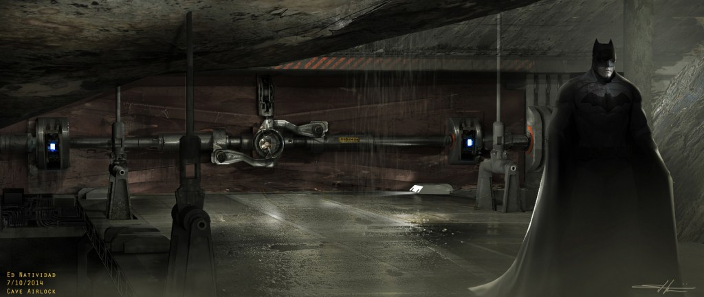 The Batcave was constructed across two soundstages at the late Michigan Motion Picture Studios along Centerpoint Parkway, Pontiac, Michigan. Production designer Patrick Tatopoulos in the Art of the Film and Tech Manual described it as “oppressive” with how the roof of the cave is very low, as though you “barely have the space to live in there.” The blocky, minimalistic, concrete aesthetic of the Glass House above is reflected in the design, which is arguably a reflection of Bruce’s anti-social attitude. The intention with the architecture was to make everything suspended from above to be “reminiscent of the concept of a bat,” and work tables in the lab are attached to a gantry system on the ceiling for moving them around. You can see the official Batcave behind-the-scenes featurette on YouTube. Warner Brothers and Google Maps collaborated with Territory Studio to create a 360-degree virtual tour of the Batcave set which is sadly no longer available, but you can still see videos of the tour. The sequences here were shot in June or July 2014 when the crew were filming in Pontiac.