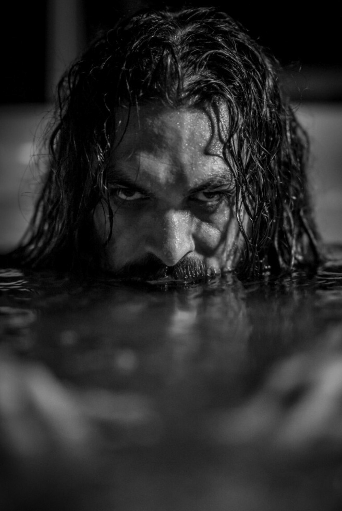 Cuts to one of them, UUV Alpha 2, closing on a large gash in the bow of the ship, where two reflective eyes are visible in the darkness. In a few seconds, the mysterious being reveals himself to the probe. Covered in tattoos of fish-like scales, Arthur Curry emerges with a quindent pointed at the camera.