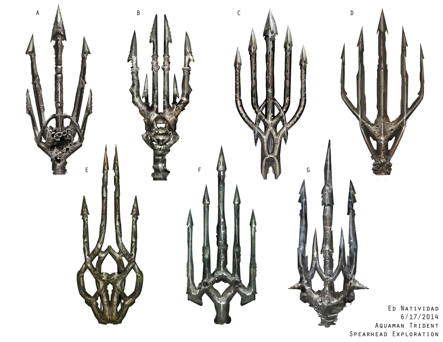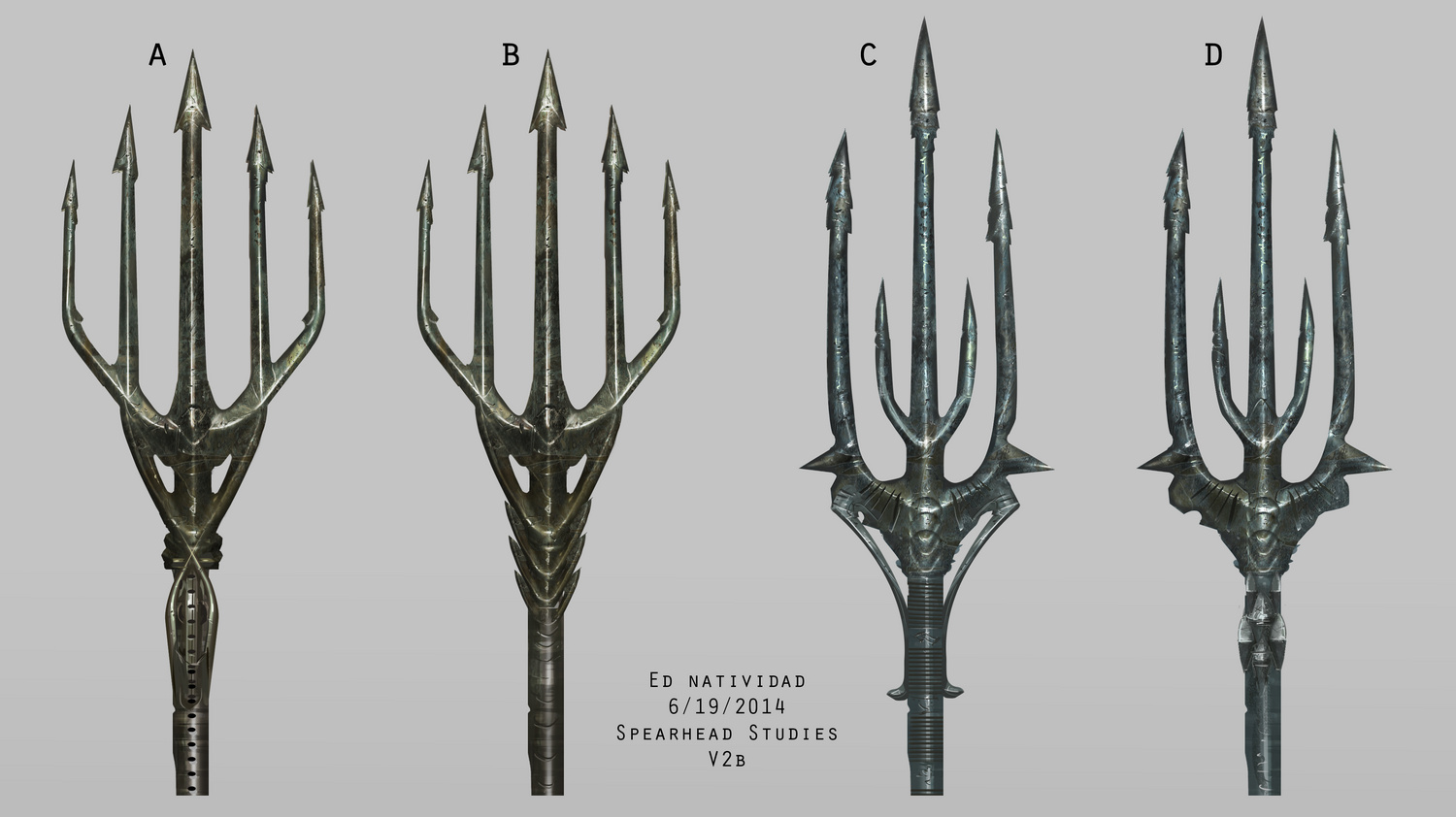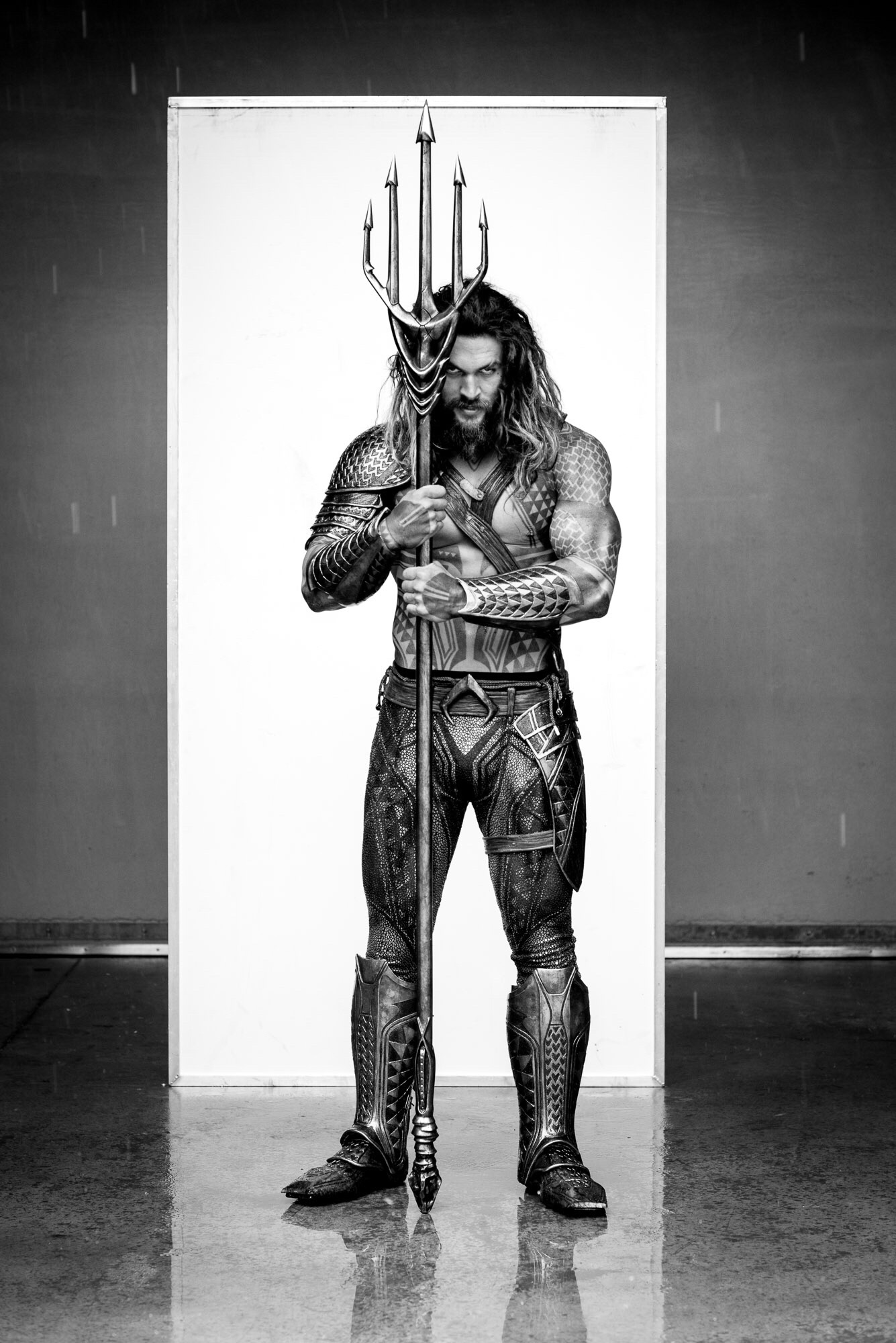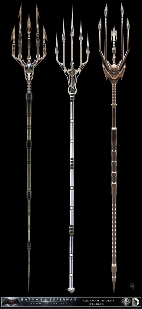 The Aquaman sequence was shot in an underwater green screen constructed at the late Michigan Motion Picture Studios along Centerpoint Parkway, Pontiac, Michigan. The sequence was shot in June or July 2014 when the crew were filming in Pontiac. Filming was done with Dorsalfin Productions‘ underwater director of cinematography, Ian Seabrook, a professional underwater cameraman, whose demo reel can be seen here, and you can find interviews with him from Underwater Podcast and Dive Photo Guide. Zack Snyder revealed the first photo of Aquaman on 20 February 2015 on Twitter after filming in Bora Bora, overlaid with the text, “Unite the seven,” which Snyder confirmed references both the seven kingdoms of Atlantis and a seventh Justice League member. Snyder later posted a test photo to Vero on 4 May 2018. Clay Enos also posted a portrait of Aquaman to his website. Concept art for Aquaman’s five-pronged trident (there is no such thing as a quindent) was provided by Ed Natividad and Rob McKinnon.