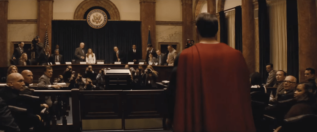 In the Comic-Con trailer, there is a rear shot of Superman approaching the podium during the Capitol Hearing. This was not used in the final film.