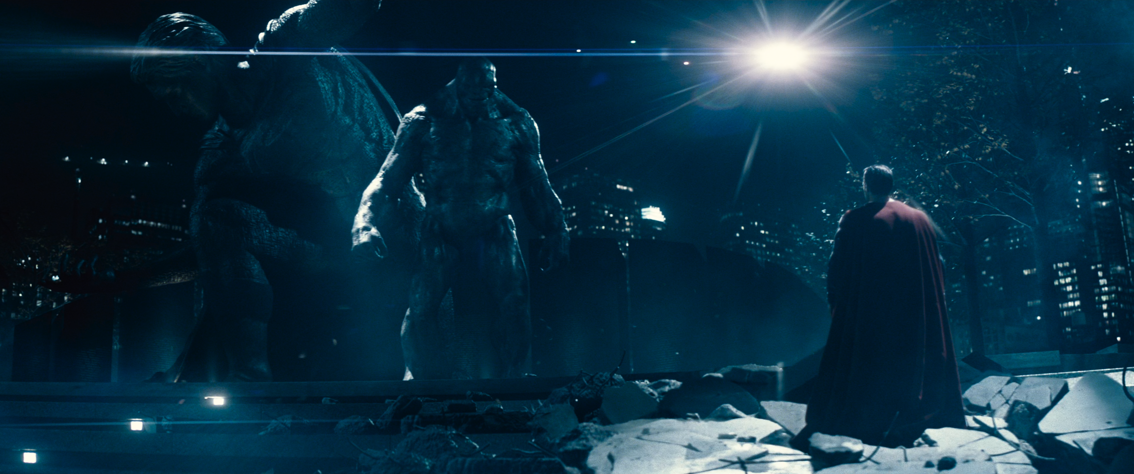 Wide shot of the monument, Superman in the right foreground while Doomsday turns to face him in the centre frame. A news helicopter circles above, dramatically moving a spotlight across the background. This amazing shot does a great job of emphasising the scale of the threat Superman now faces. The merged forms of the statue and the monster could also be symbolic of how some see Superman not as a heroic figure, but as a monster, so Superman is thus looking at himself as others see him.