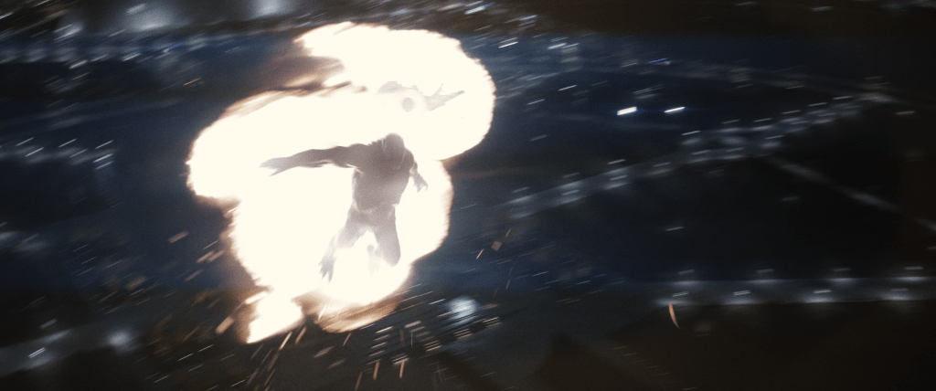 Low-angle long shot of LexCorp Tower among the skyline to see the blast spread out far across the sky in a dome, filled with orange streaks of lightning, blowing away the rooftops of the adjacent skyscrapers. This phenomenon, which the crew dubbed a “boosh”, accompanies a power growth in Doomsday, furthering his evolution. His placement on LexCorp Tower, the tallest building in the city, guarantees the safety of the city’s populace — our second oddly convenient reassurance.