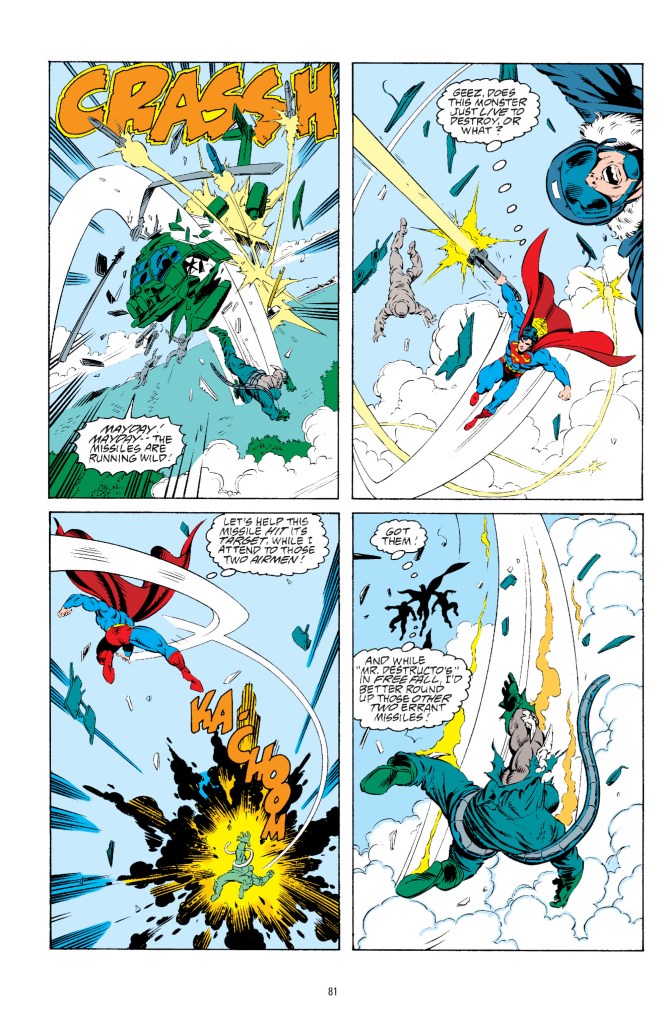 Doomsday’s enormous fist is intercepted mid-air by Superman, now hovering between Lex and the monster. Superman has saved the villain from his own folly.