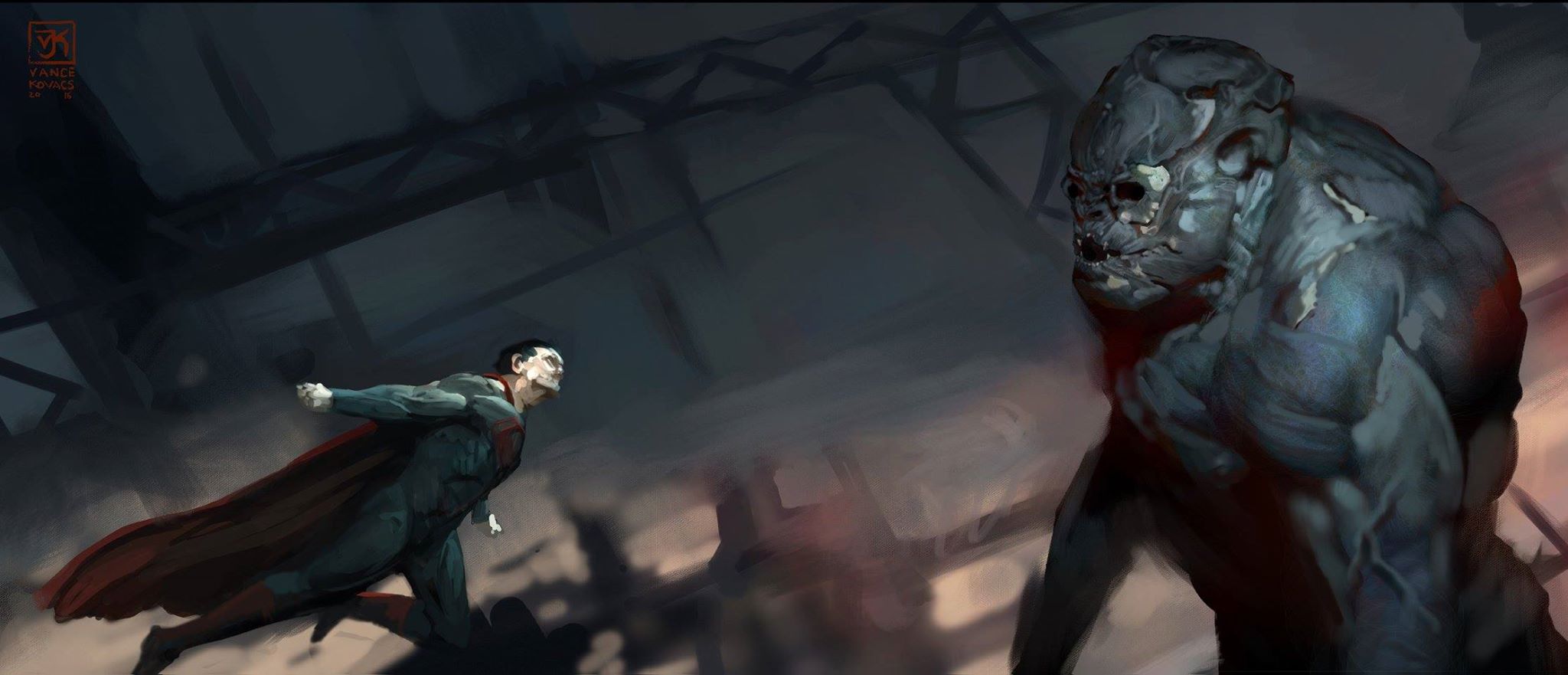 Superman skids into the ground yet again, but before he can recover, Doomsday tears one of the tablets from the ground and steps towards the Man of Steel. On the ground, Superman turns to see the monster coming at him, but is too late to react. Very symbolically, Doomsday piledrives the superhero with the slab; quite literally smashing him over the head with the names of the people he could not save in Man of Steel. As the remains of the black marble fall away, the monster reaches down.