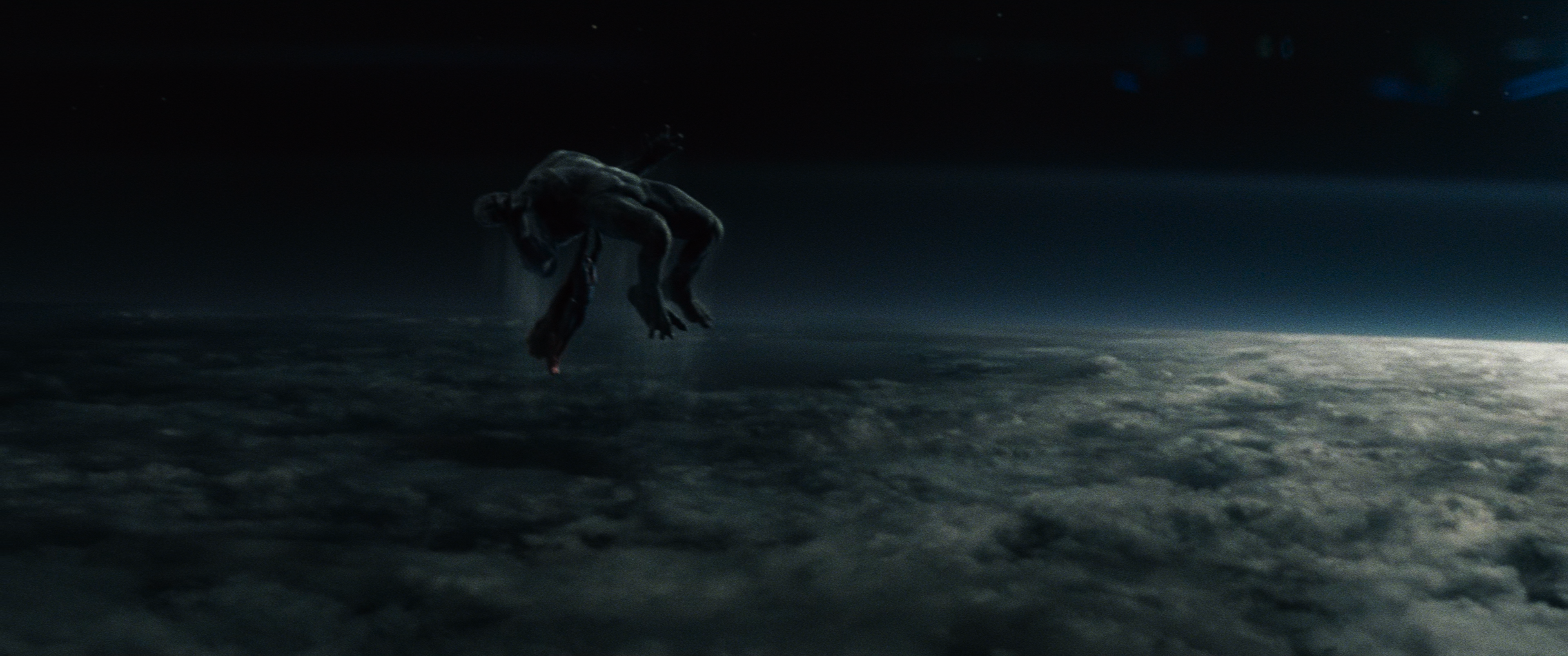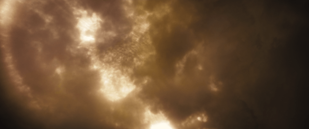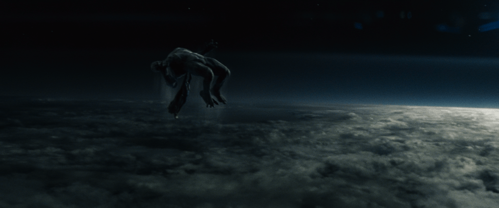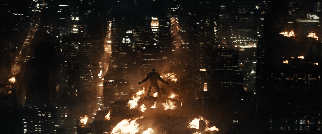 The Batwing soars over the Metropolis skyline. We turn to follow its pass and stop to see the spectacle in the sky. Through the clouds, beyond the atmosphere, is an enormous explosion. Batman’s words can also subliminally put God in the viewer’s mind in association with this heavenly, terrible spectacle.