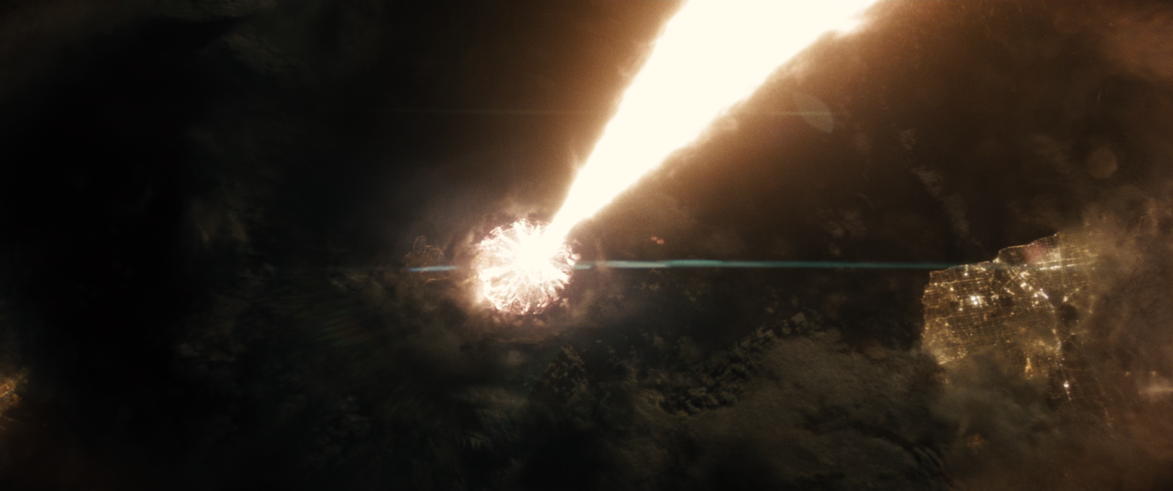 In Gotham, Lois exits the abandoned Wayne Station, stepping out into the open air to look up at the burning sky from which a fireball descends to Earth over the bay.