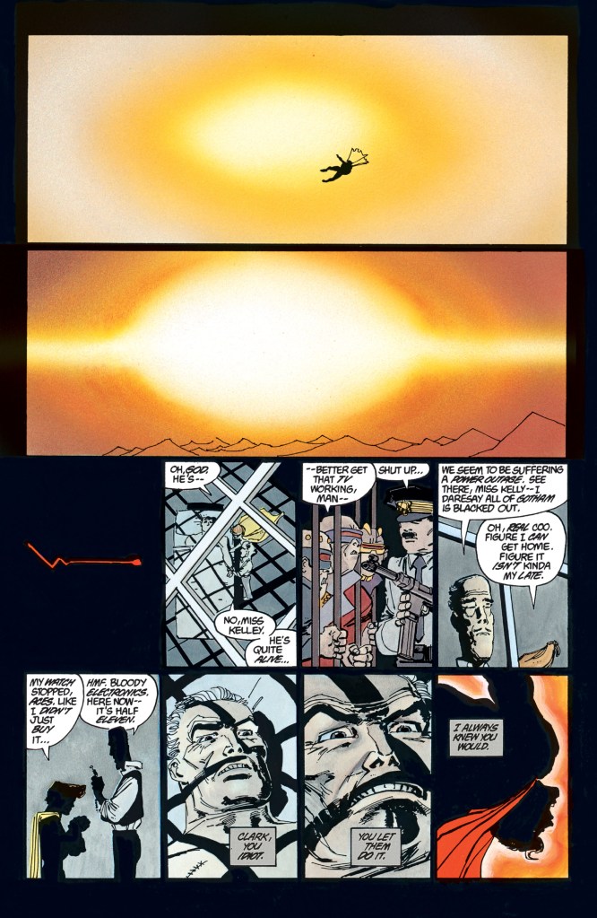 This haunting image is taken directly from The Dark Knight Returns, where Superman is reduced to a shrivelled skeletal form after tanking a nuclear explosion from the missile he successfully deflected. This shot also bears a striking resemblance to Michelangelo’s The Creation of Adam (1508-1512), a painting by Michaelengelo that depicts God and Adam reaching for each other with their fingertips, and Superman here is in the place of God, which would also fit with the idea of Superman’s destiny being to guide humanity. It might also be another visual nod to the ending of Stanley Kubrick’s 2001: A Space Odyssey (1968), where the protagonist becomes a foetus-like being floating in orbit above Earth.