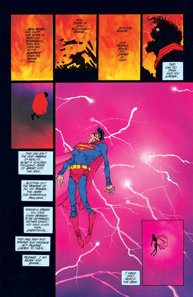 This scene combines elements from two stories. Superman trying to fly Doomsday into space is taken straight from the original The Death of Superman (1993), and Superman being caught in a nuclear blast and shrivelling up into a husk comes straight out of The Dark Knight Returns (1986), so both have been perfectly combined here. It may also have taken inspiration from Superman: Earth One Volume Two (2012), where the Parasite becomes a hulking monster after absorbing Superman’s power and the military fires a nuke at him to no effect.