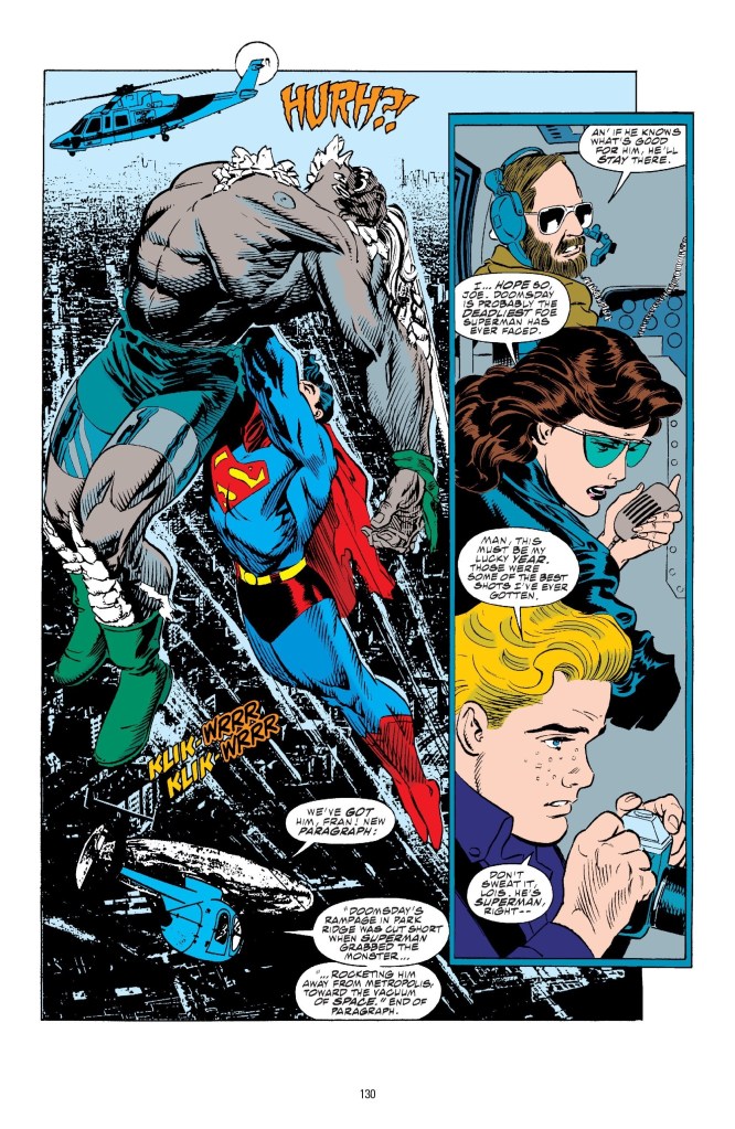 Doomsday is spinning through space when Superman collides with the brute, closely followed by the nuclear warhead. He grapples with the monster’s head. Doomsday seems confused for a moment before reaching back to grab his assailant, vainly trying to tear him off, but the superhero maintains his firm grip on the roaring beast.