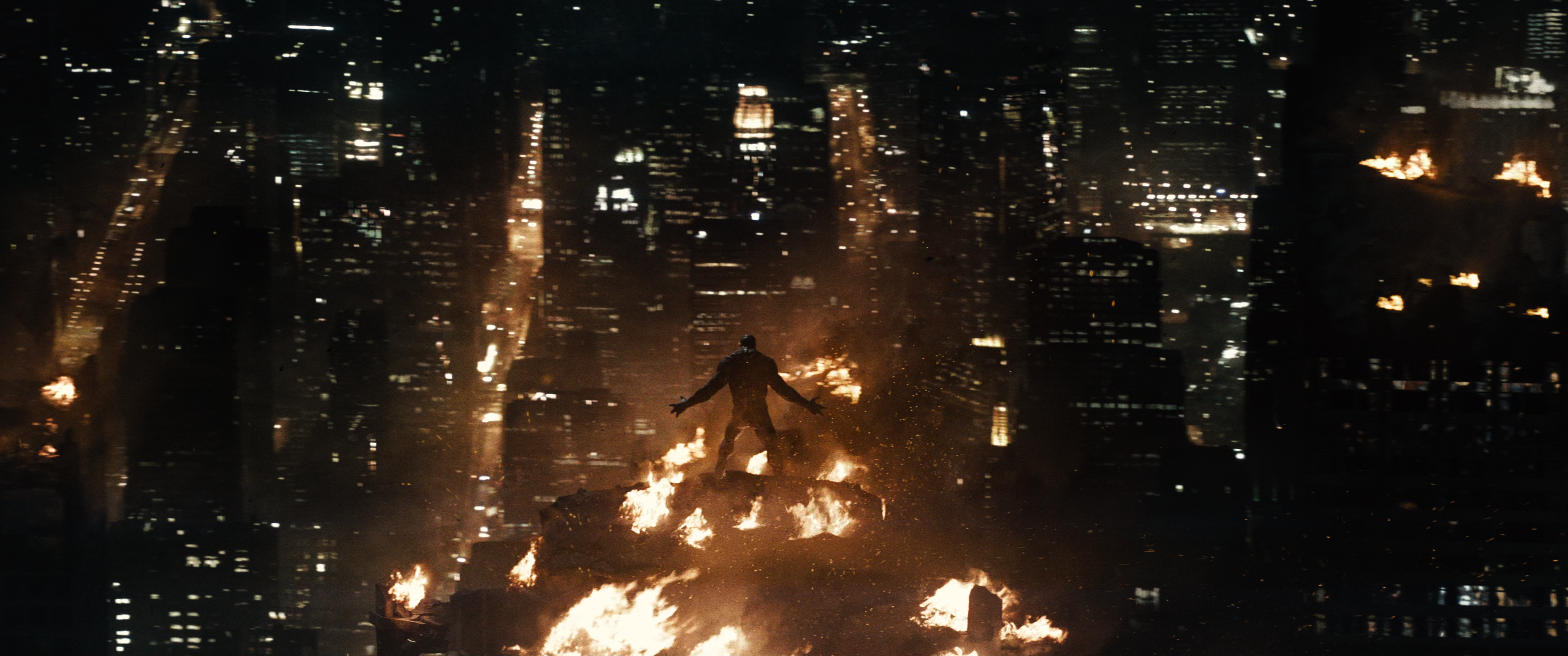 Cut to circling Doomsday as he roars at the city below with unrestrained rage from the flaming top of LexCorp Tower. His position and continued roaring make the monster appear dominant and unstoppable, having annihilated all his enemies like something out of a classic monster movie.