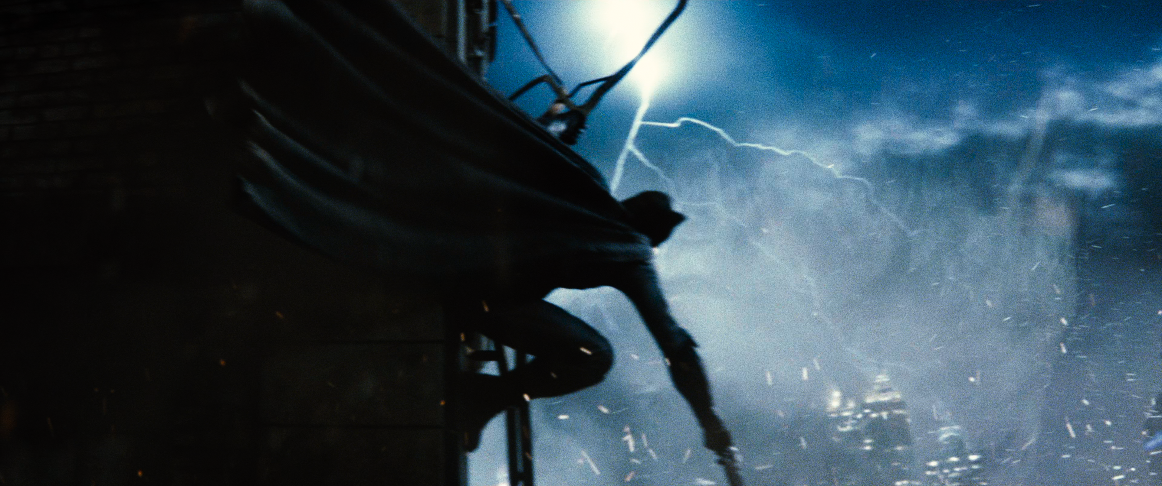 Cut to smoke, emerging to see Doomsday falling through the air towards Gotham and arcing his heat vision across the view, aiming for the Batwing. They descend into the darker area of the city, the abandoned port, with Wayne Station visible below. Doomsday fires his heat vision again.