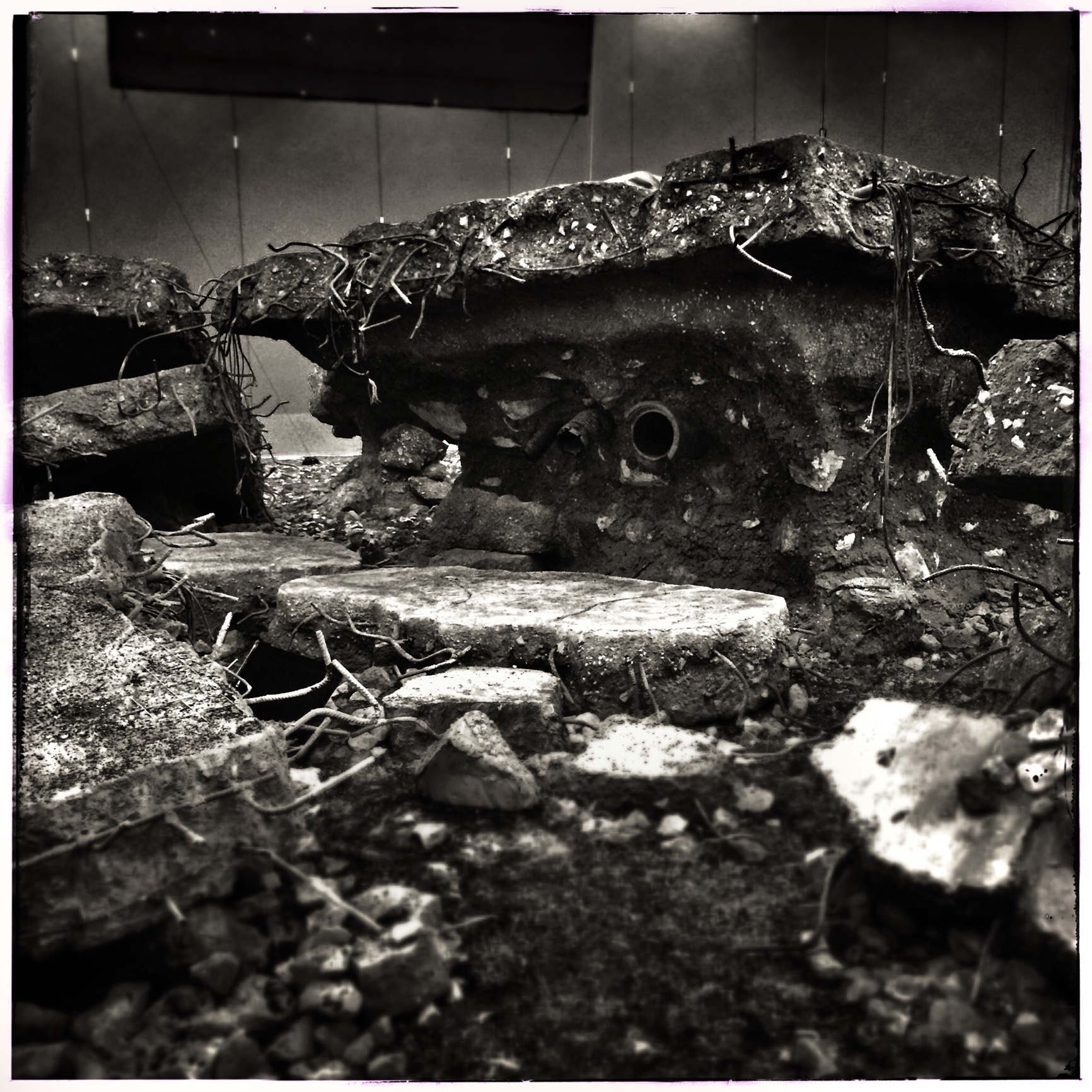 Low-angle on the debris, light shining through the cracks. Escape is so close, yet so far.
