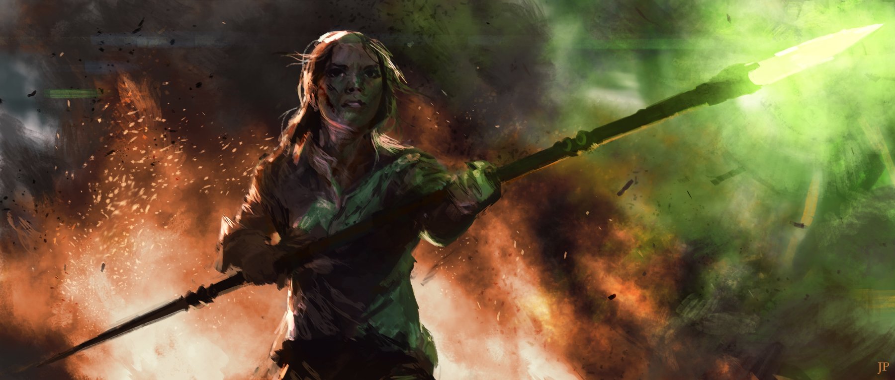 Seeing the weapon, Lois grabs the spear steps away from Superman. She readies the spear like a javelin and launches it away with a yell of effort.