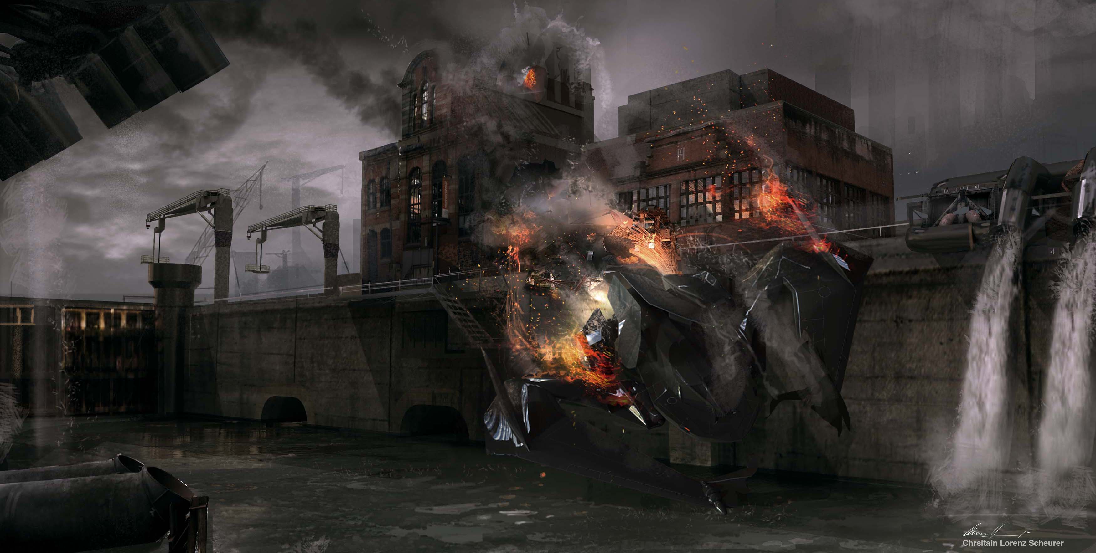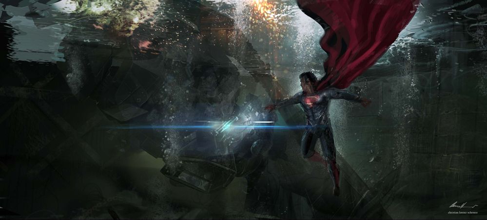 Zack Snyder mentioned during the BvS Watch Party that the idea for the flooded stairwell came from a flooded area they found at Michigan Central Station. He later confirmed in the director’s commentary (2:15:16) that the pool was built on a soundstage at the late Michigan Motion Picture Studios, Pontiac, Michigan. The sequence was shot in June or July 2014 when the crew were filming in Pontiac. Concept art by Christian Lorenz Scheurer (above) indicates an earlier concept had Batman keep the Kryptonite spear in the Batwing, which would crash in a Gotham canal where Superman would later retrieve it from the drowned vehicle, showing how the “baptism” concept was always part of the plan.