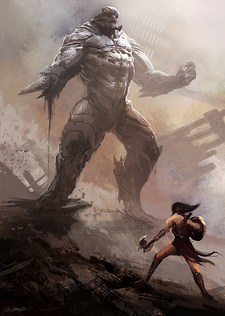 Wonder Woman’s back is forced against some unmoving debris. She glares before charging at the beast again with unnatural speed and another banshee’s roar.