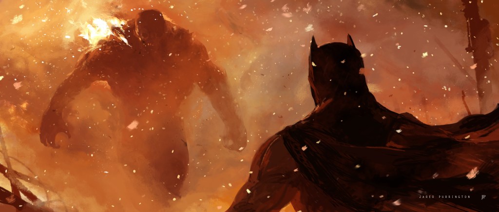 Meanwhile, Doomsday has finally noticed Batman. The monster turns to him, rearing into a ferocious attack pose. The lighting darkens Doomsday appropriately, silhouetting making his visage look especially terrifying and emphasising his gigantic stature.