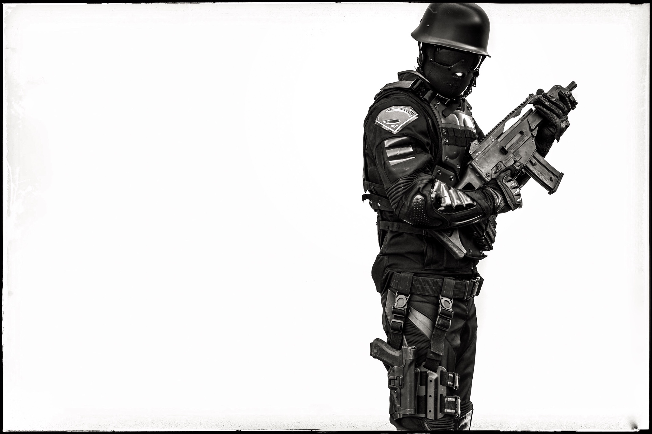 Another vehicle’s doors burst open as yet more armoured troops pile out. They are all armed with Heckler & Koch G36C assault rifles, Kel-Tec KSG shotguns, and Glock 17 sidearms. Each one has a Superman shield patch on their shoulder.