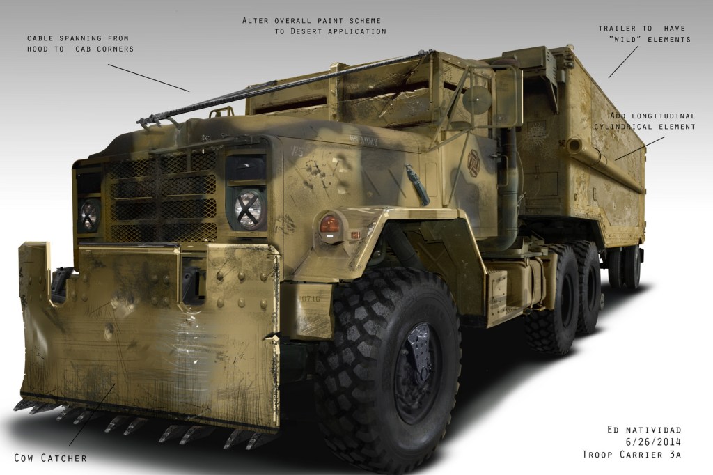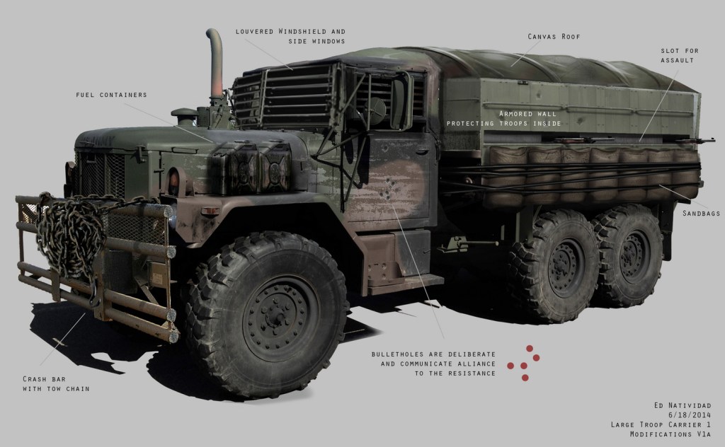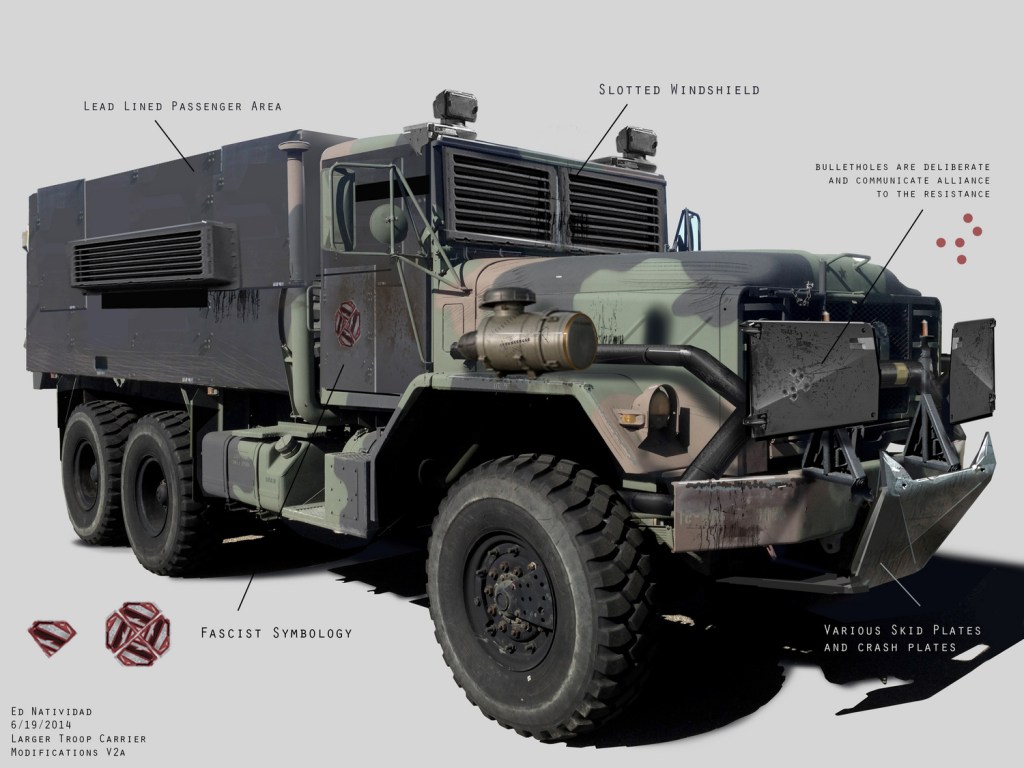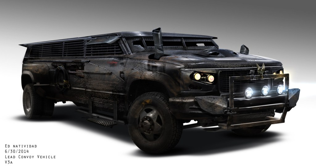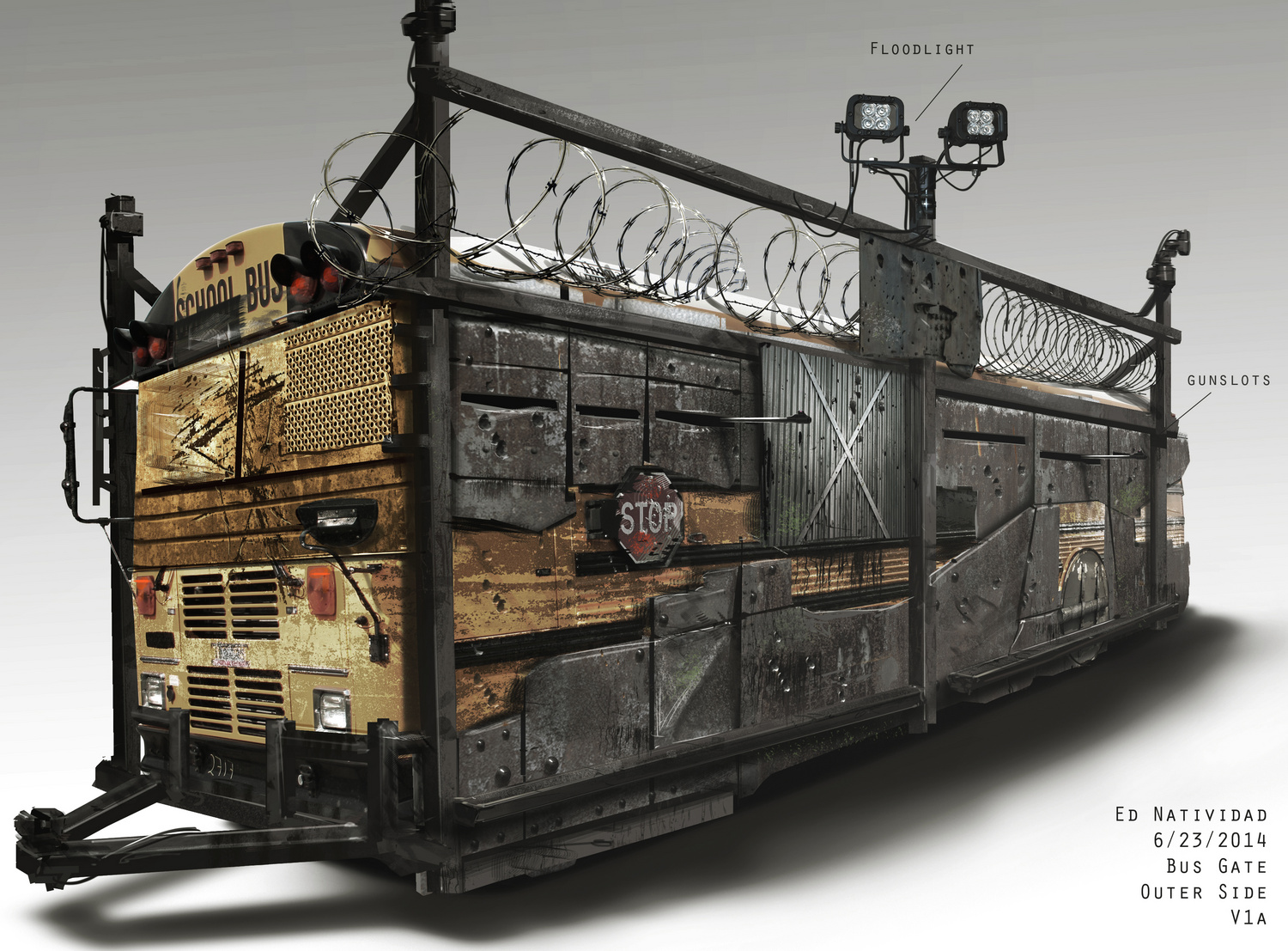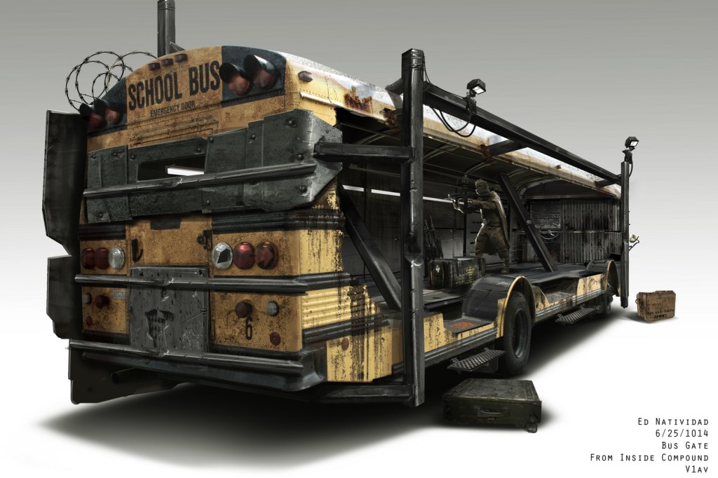 Low-angle shot of a school bus, modified with plates of armour for cover, possibly referencing the armoured school buses from Zack Snyder’s Dawn of the Dead (2004). Indicative of a loss of innocence, it rumbles by us.