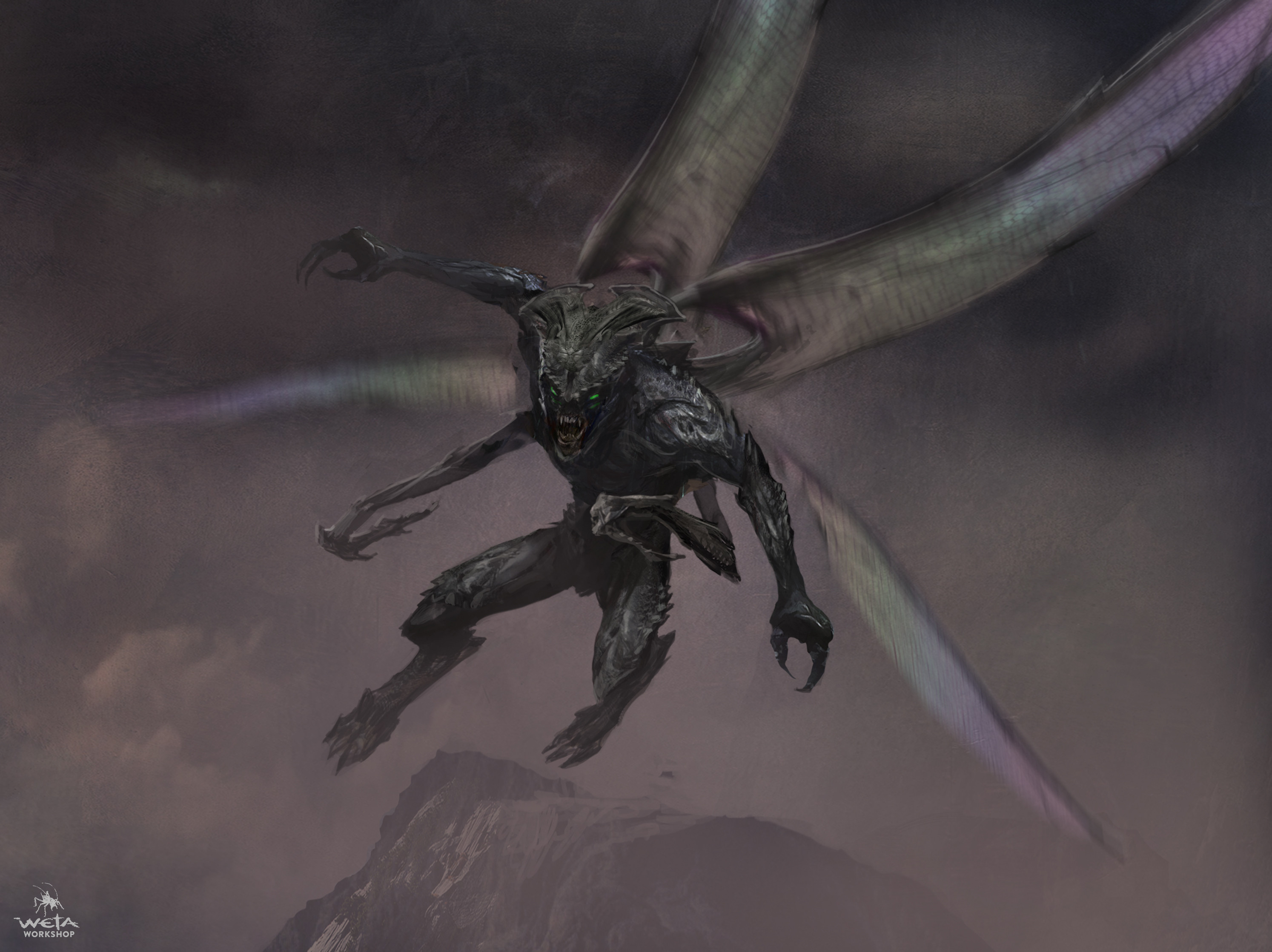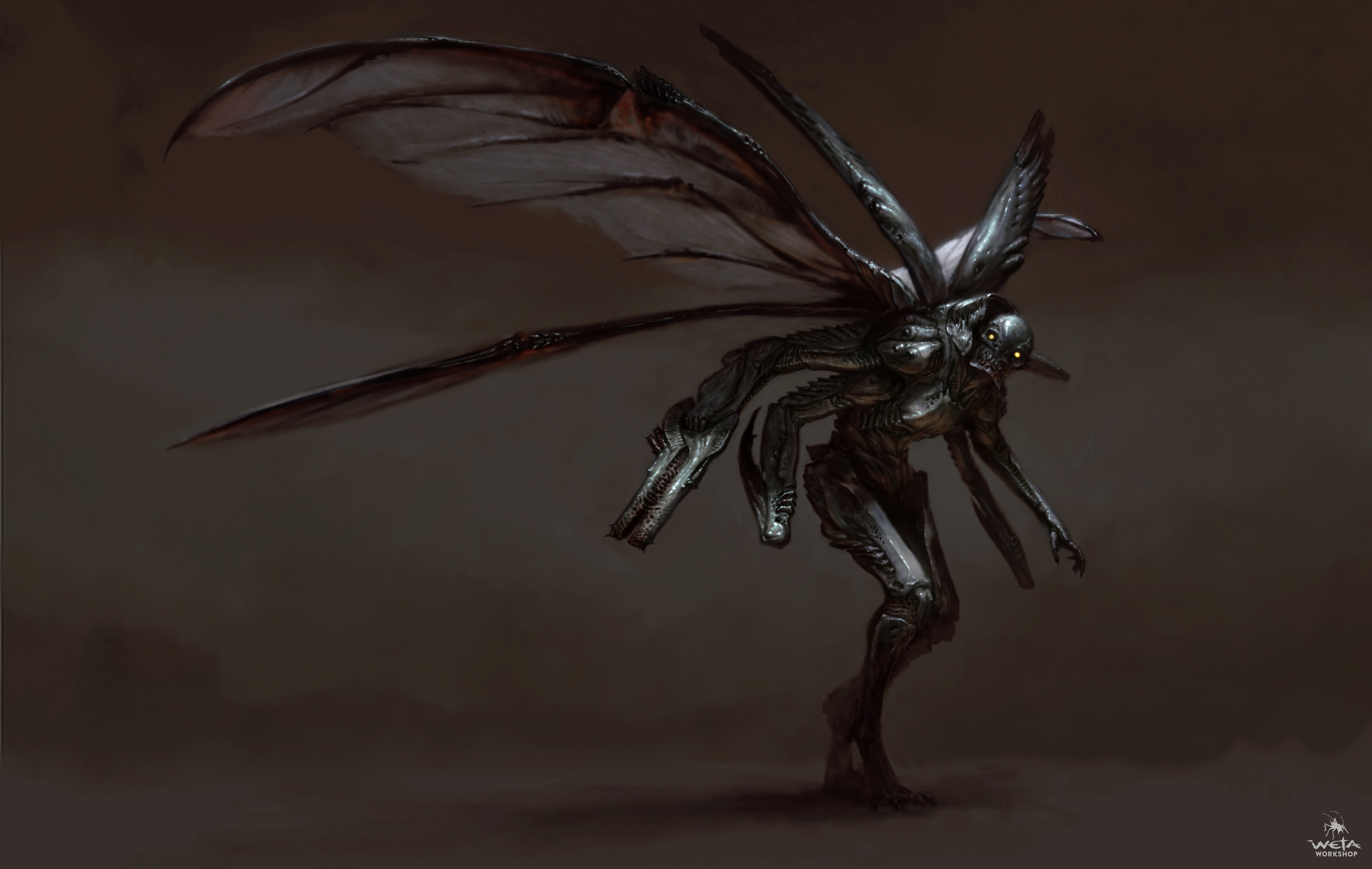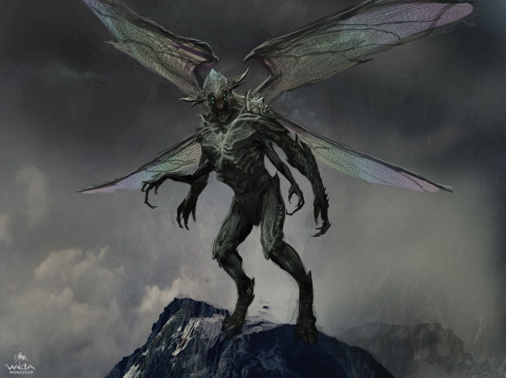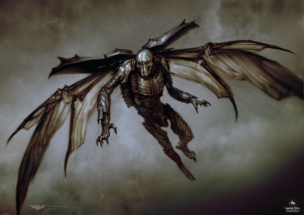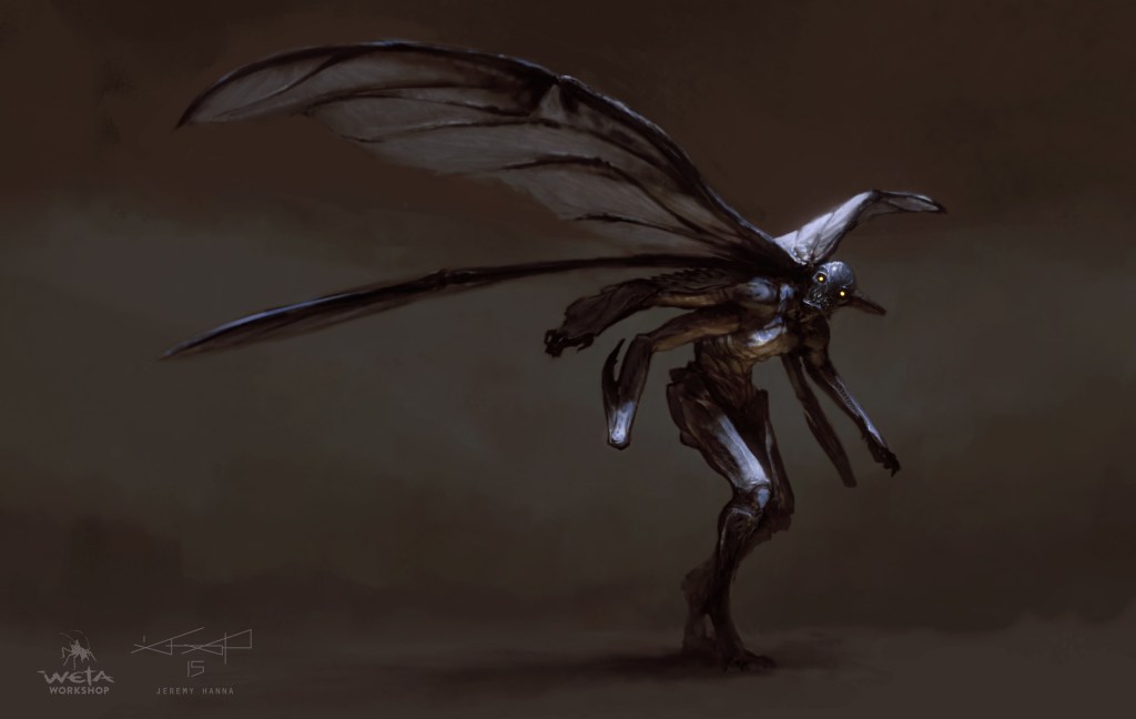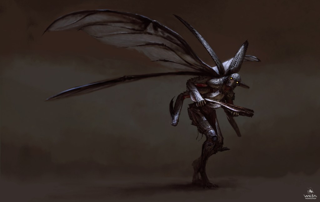 During this scene, we see two types of Parademons. The first is highly insect-like and skinny, with spindly digitigrade legs. Concept art for Justice League confirms that these were originally going to be the main grunts of Steppenwolf’s Parademon legions. The second type we see are plantigrade and larger. Weta has some concept art for the Parademons here and here on ArtStation. Check here for a turntable video of a design by Jerad Marantz, a VFX artist who worked on Zack Snyder’s Justice League. On Instagram, Wētā Workshop said, “Our aim here was to blur the line between organic and technological forms. We intentionally made it difficult to distinguish the creature from their armour, breather, and weaponry.”