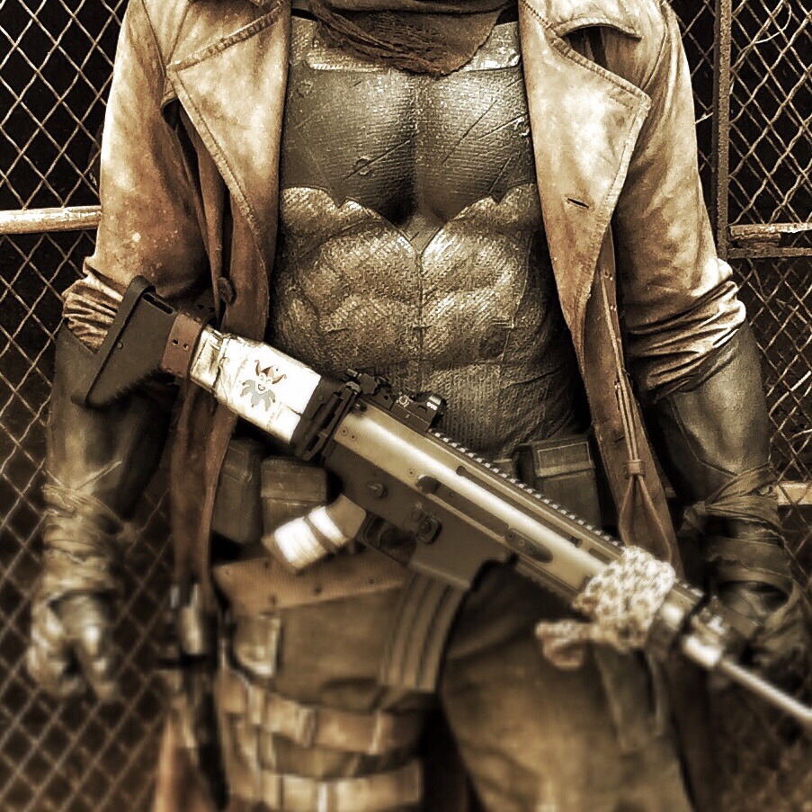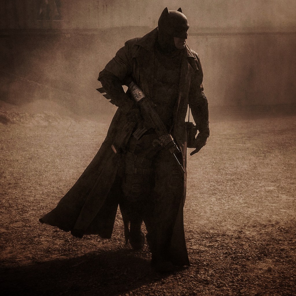 Medium rear shot on Batman opening a large metal door, illuminating the darkness with the gold light outside. The aspect ratio has changed to the IMAX ratio in the darkness. Batman then steps out into the windswept and gold-tinted outdoors. @Mercuryinretro1 suggested this may be a parallel to the earlier dream sequence, Bruce opening a door into a nightmare in both. Instead of his usual suit, he is wearing a brown trench coat. He has a belt over his shoulder to carry a FN SCAR-L assault rifle on his back, which is one of the first things we see, quickly giving an indication of how things have changed. Now, Batman uses guns casually. A joker card is taped to the stock, the same the Joker uses in early Batman comics and Batman: The Animated Series (1992-1995).
