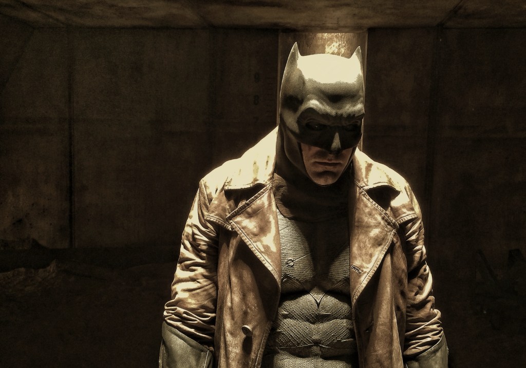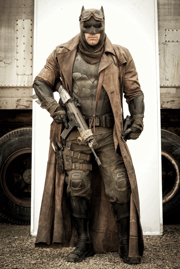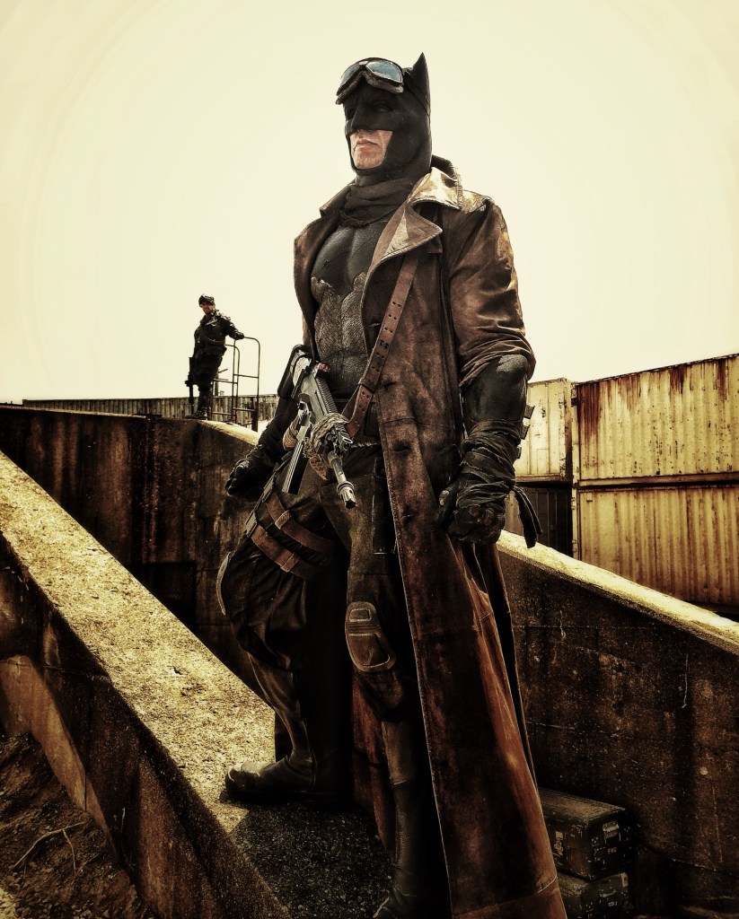 Zack Snyder posted a multitude of Kightmare Batman photos [1/2/3/4/5/6/7/8]. At the time, he also took this photo of a miniature meeting between Batman and R2-D2, and Clay Enos took this photo of Snyder taking the shot (Snyder put both photos on Vero). Both Enos and Snyder posted clean photos of the Superman soldiers. Director of photography Larry Fong took photos of Heaven and Snyder posing. Other set photos were posted by Ben Affleck’s stunt double Richard Cetrone [1/2], set costumer Kate Abraham [1/2] and Doug Stewart [1/2/3/4/5]. Key second assistant director Misha Bukowski posted this photo. One of the film’s storyboard artists, Jay Oliva — also known as a prominent director of DC animated films — drew this image of Knightmare Batman. Damon Caro’s photo gallery on IMDb has two more photos of the set. The father of Richard Cetrone, Ben Affleck’s stunt double, was invited to the set to spend the day with his son.