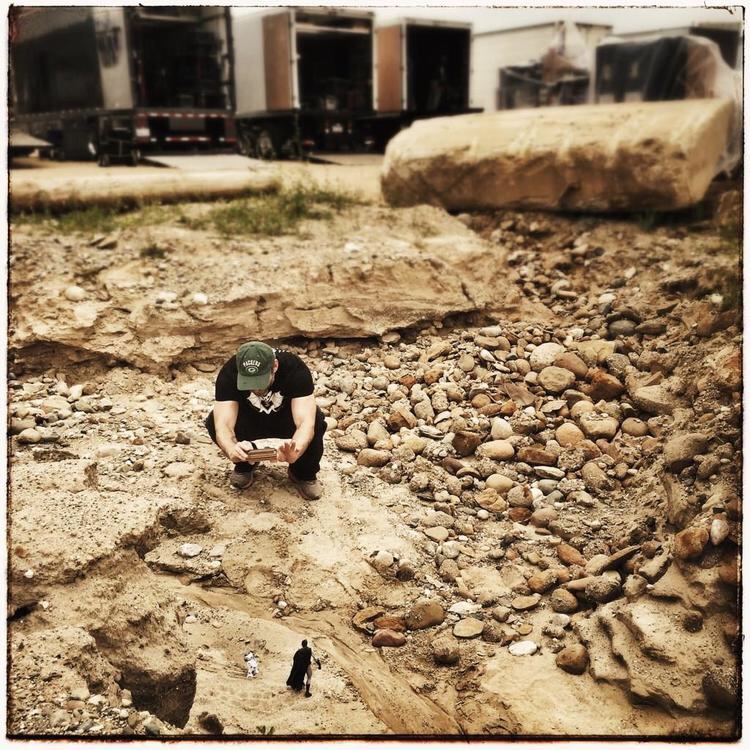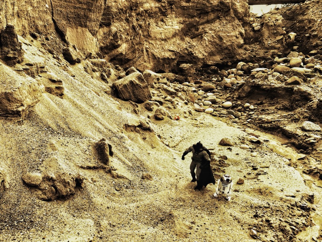 On 2 August 2014, Zack Snyder tweeted a photo of a Batman and R2-D2 action figure in a small rocky desert canyon along with the words “BATMAN & R2BIN” as part of his referential back-and-forth with J.J. Abrams, who was directing a Star Wars film at the time. Years later, Snyder would post the photo on Vero alongside another photo taken by director of photography Larry Fong.