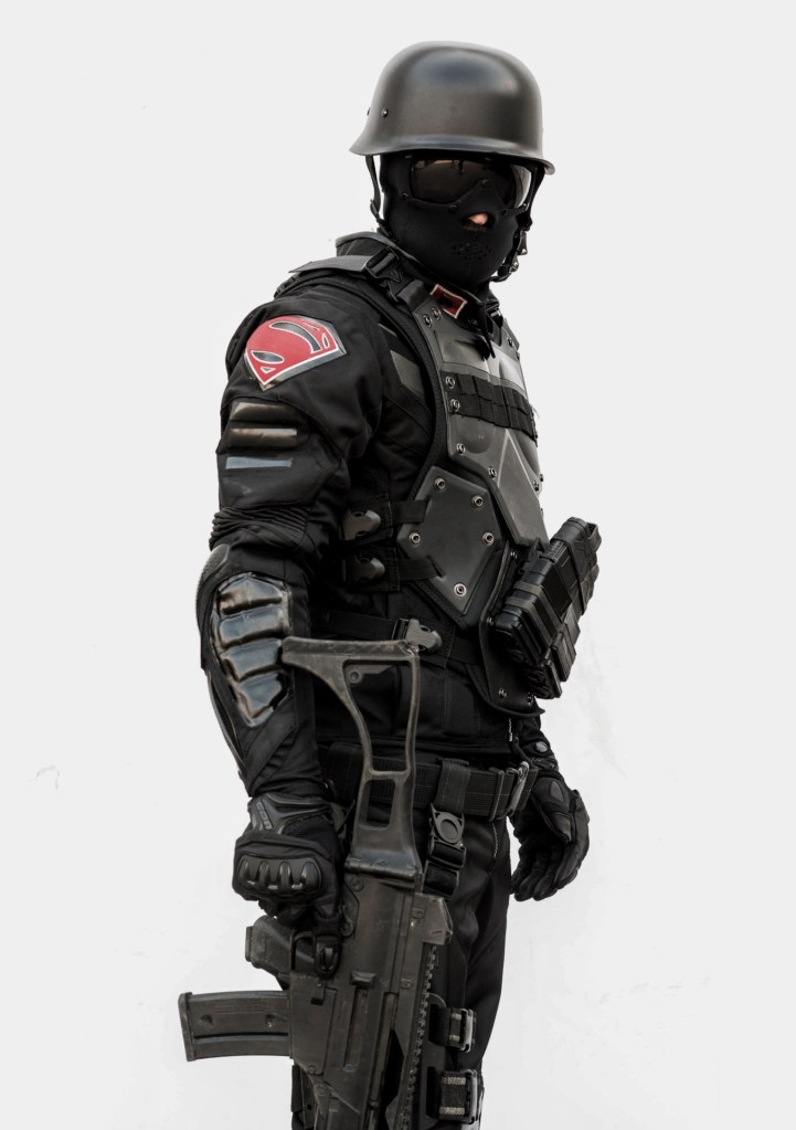Outside, the hooded figure rips off his cloak to reveal a black military uniform He angrily points a machine gun at the freedom fighters, yelling at them, “Get down!”