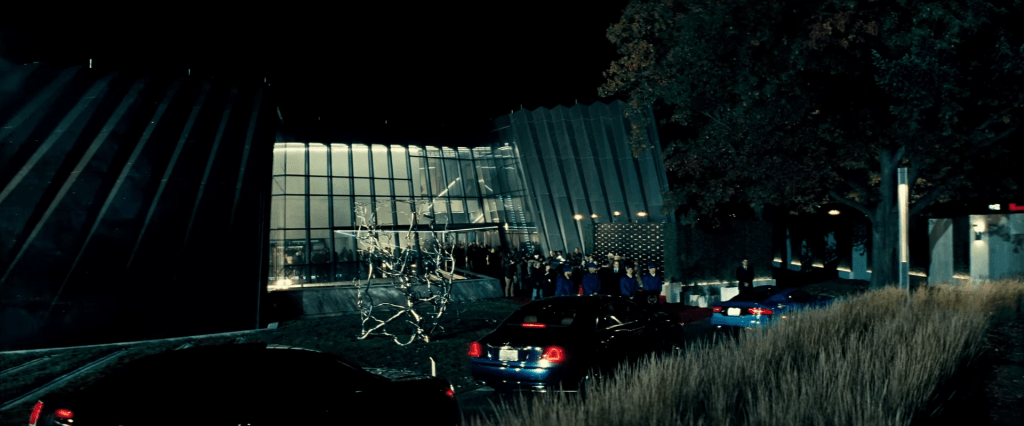 Lex’s home is shot at the Eli and Edythe Broad Art Museum, 547 East Circle Drive, East Lansing, Michigan, on the Michigan State University campus. You can check out a virtual tour of the building, or check here for detailed images and even schematics. On 22 January 2014, Zack Snyder scouted the location for an hour with production designer Patrick Tatopoulos and MSU’s film liaison Kevin Epling, who had suggested the location to the crew. While there, Snyder had a photo taken with athletic director Mark Hollis and basketball coach Tom Izzo. Lansing City Pulse got an interview with Epling. Set construction began in early October, adding a red carpet, step and repeat banner (depicting logos for LexCorp, Metropolis Public Library Renewal Project, Under Armour, and Dodge), fake walls and hedges, and replacing the Starbucks with a modern bar. Michigan film stalker Bananadoc snapped several photos of the exterior construction site. By the 19th, the set had been deconstructed. Art director Lorin Flemming designed the set, and you can find detailed photos of the layout and conceptualisation at her website.