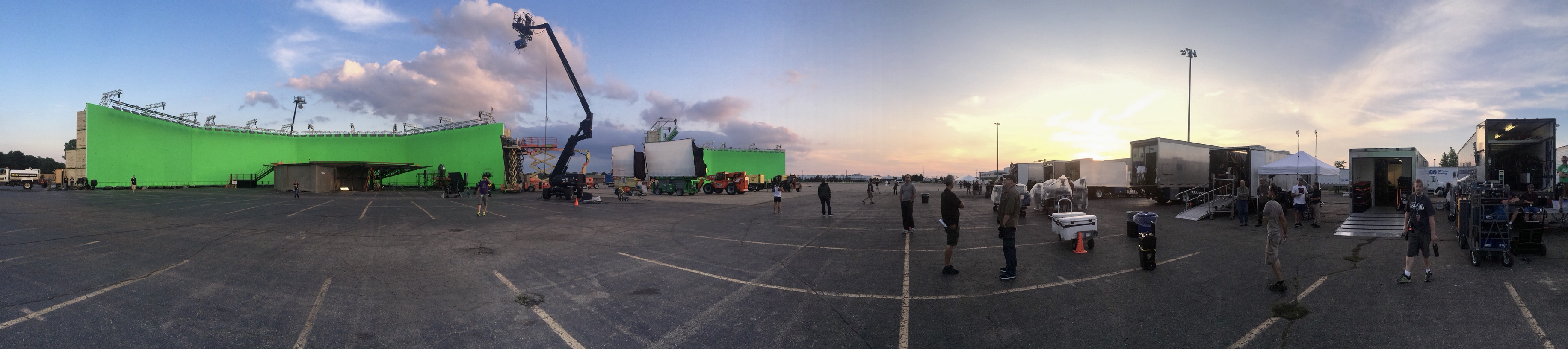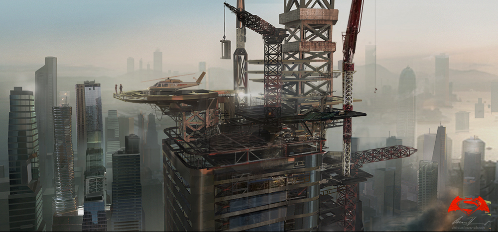 The LexCorp helipad was shot at an outdoor green screen set right beside the Heroes Park set at the late Michigan Motion Picture Studios along Centerpoint Parkway, Pontiac, Michigan. The helipad itself was constructed for real, raised slightly above the ground. The helipad sequences were likely shot around 20 June 2014 due to the presence of the LexCorp helicopter. On Vero, Zack Snyder [1] and Clay Enos [1/2] have photos, and concept artist Christian Lorenz Scheurer has artwork of the scene.