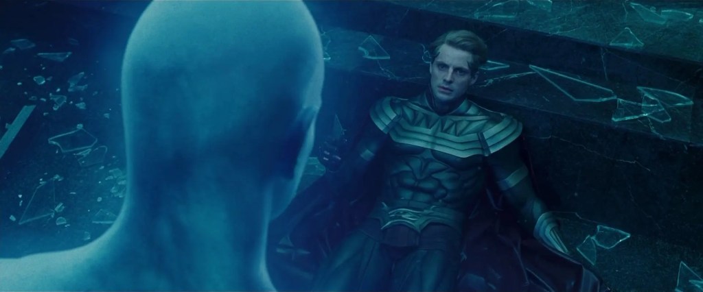 Shoulder shot from Superman as he descends on the platform towards Lex below. @ZSShots on Twitter pointed out that this shot might be a symbolic reference to Zack Snyder’s 2009 cinematic adaptation Watchmen, where Doctor Manhattan shrinks from his giant form as he approaches Ozymandias. In both shots, a hero god is looming over a genius yet villainous mortal.