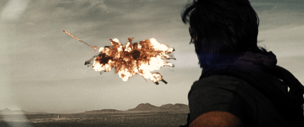 Cut to somewhere in the desert, where Knyazev stops. He turns on his bike to watch the fireworks.