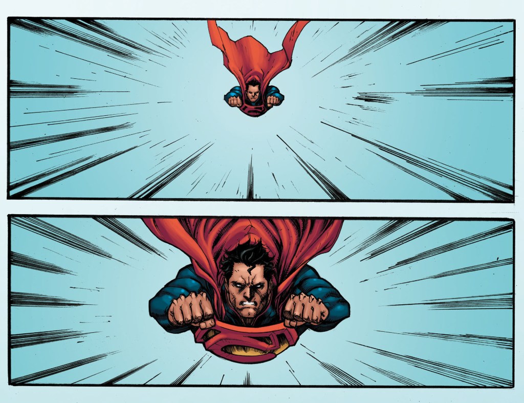 Cut to Amajagh, but we pan down to Lois, still smiling. A smart woman, she drops her hands from Amajagh’s arm around her throat after a moment’s pause. Her breathing slows, relaxing. She nods at Superman, trusting him to take care of this.