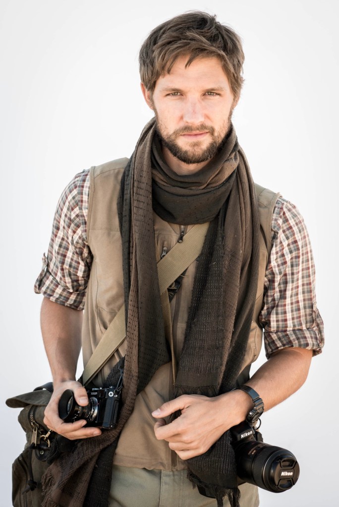 While he speaks, Jimmy, still kneeling, looks around uncomfortably before gently standing, watched closely by the rebels and mercenaries as he unhooks his Nikon S3 (Black Edition) 35mm camera from around his neck.