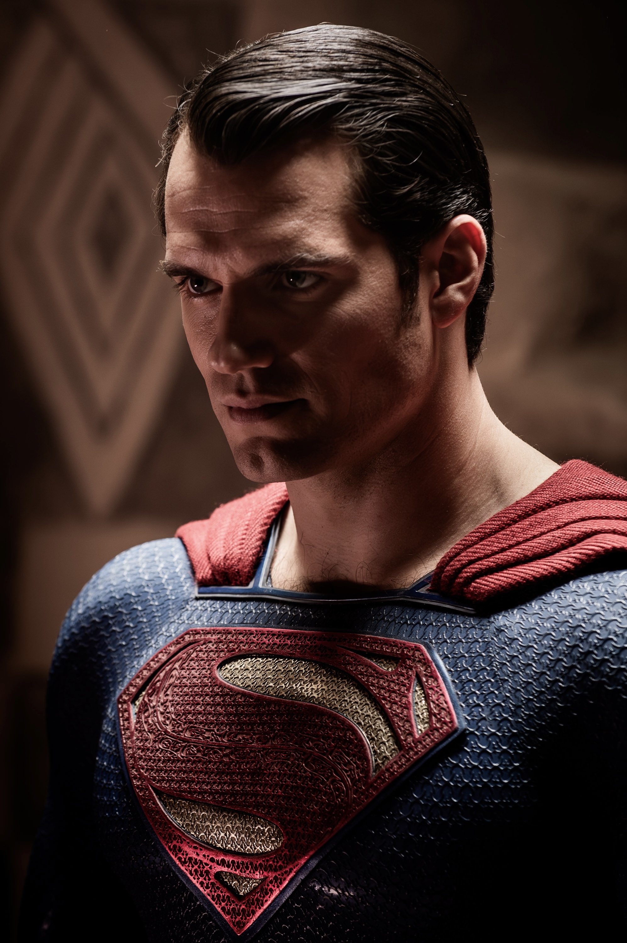 Medium shot on Superman, standing up straight. His head is bowed, but the iconic Kryptonian symbol of hope on his chest is prominent here — the arrival of hope. The camera closes on his face when he suddenly turns his head up, looking angry at the endangerment of the women he loves.