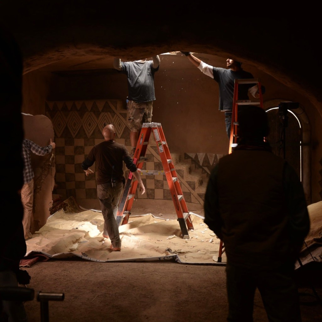 “We looked at New Mexico and found a training compound for the army. Cinder block walls and places for the guys to train and little huts, but very typical, modern, low buildings. So, what we had to do, I said to Zack, ‘We need to create the ancient part of it.’ It was an amazing experience, as we created those buildings the way they used to build them with wood and mud, and then starting to decorate it slowly and putting up paintings that they might have on the walls.”