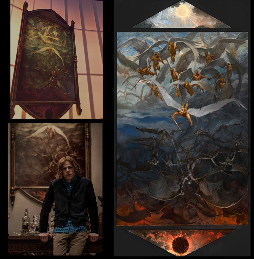 The painting was designed for the film, but was clearly meant to resemble a painting by Gustave Doré for John Milton’s Paradise Lost, which depicts angels banishing rebel angels from Heaven. This painting is similar, but with angels and demons engaging in battle instead. Concept artist Alex Kovacs helped with the painting, or at least a version where the pose of the lead angel is different.
