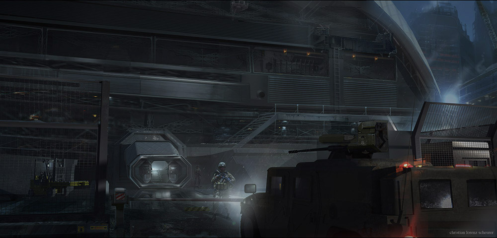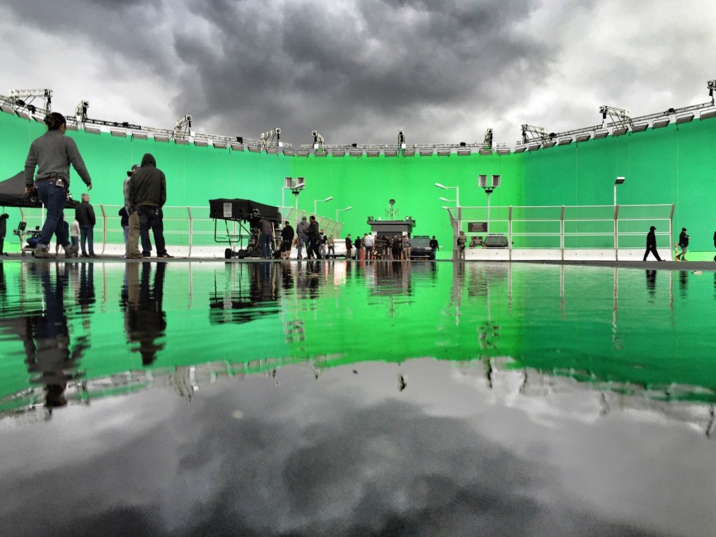 The scout ship entrance checkpoint was constructed as an outdoor green screen at the late Michigan Motion Picture Studios along Centerpoint Parkway, Pontiac, Michigan, directly across the street from the LexCorp location. Military vehicles present were real. On 4 June 2014, with a week’s notice, extras signed up for military roles were called for fittings in preparation for 11th shooting all day into the night for the checkpoint sequences. The shoot was then rescheduled for the 13th due to rain. A month prior on 12 May, Jesse Eisenberg said he would begin filming in exactly one month, so this was likely one of his first scenes shot for the movie. Set photographer Clay Enos and electrician Erica Kim both got photos.
