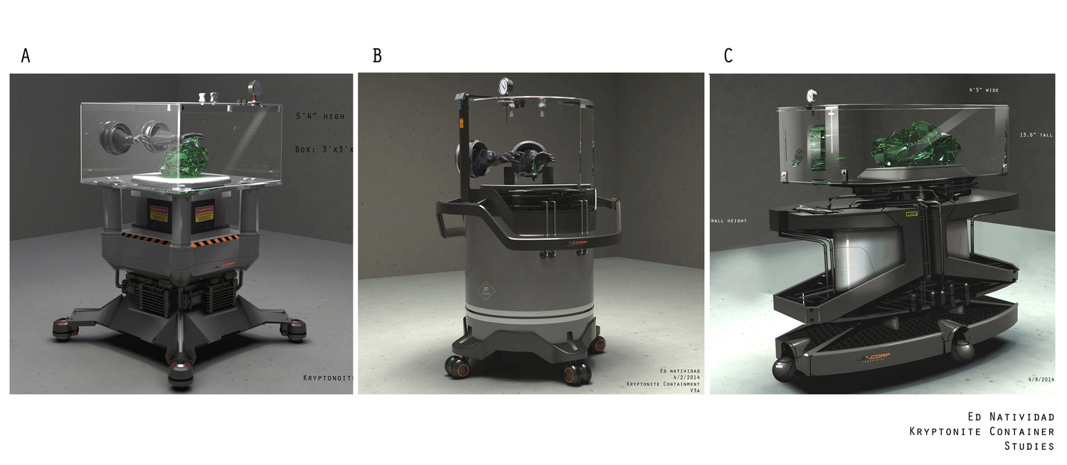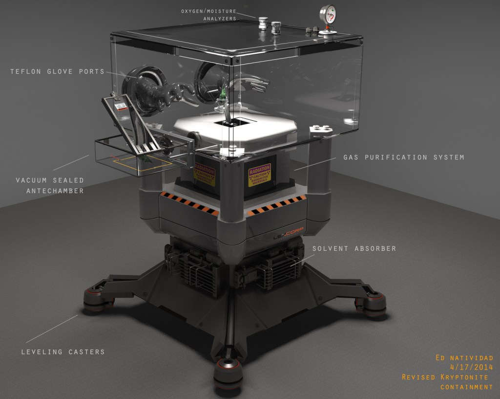 LexCorp Research Park was shot at 2011 Centerpoint Parkway, Pontiac, Michigan, a former General Motors building. During his time there, director of photography Larry Fong posted these photos to Instagram. The lobby was shot inside the building and dressed with a myriad of modern amenities to create a lively, hip tech company. On 12 May 2014, Jesse Eisenberg said he would begin filming in exactly one month, so this was likely one of his first scenes shot for the movie, and interior LexCorp filming was scheduled for around the 12th and 13th of June before rescheduling to the 16th and 17th. Concept artist Ed Natividad has conceptual renders of the Kryptonite container on his website.